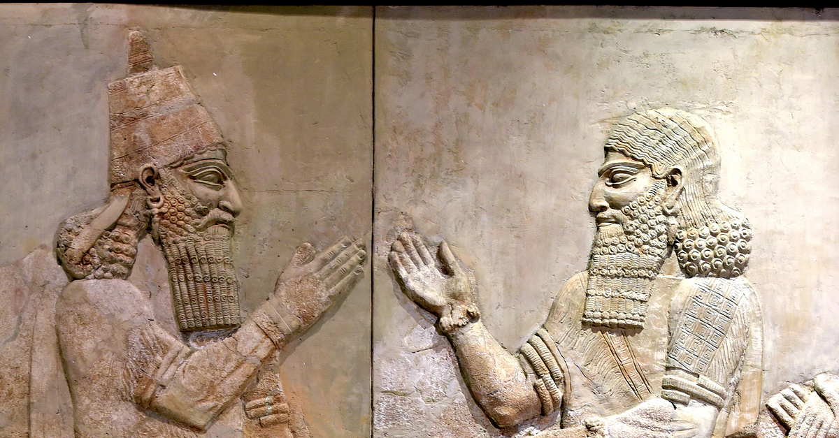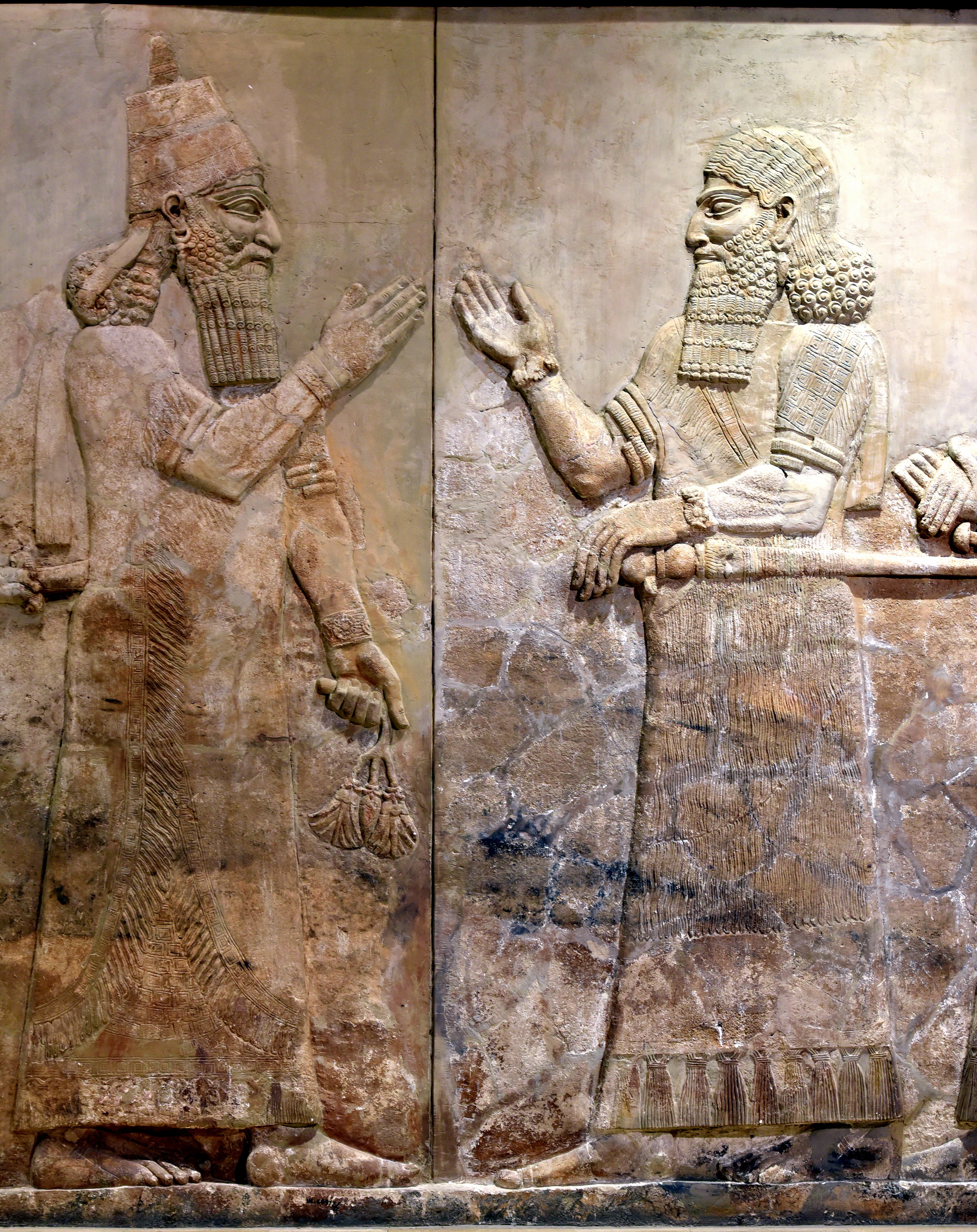 This almost 3 meters high alabaster bas-relief depicts the Assyrian king Sargon II (left; wearing the typical conical hat). Recognizable by the long sword hanging on his side, diadem, long curly beard, and the elegant dress, a figure greets the king in close proximity, almost touching him, indicating a very high-ranking official. This is Turtanu (in Assyrian); he is the chief-in-command of the king and 2nd in command of the whole Assyrian empire. This relief is part of a long tributary scene, where the king stands majestically, waiting to receive the tribute from Urartu (modern-day Armenia). From the Royal Palace of Sargon II at Khorsabad, in modern-day Nineveh Governorate, Iraq. Circa 710 BCE. On display at Room X of the Iraqi Museum in Baghdad, Republic of Iraq.