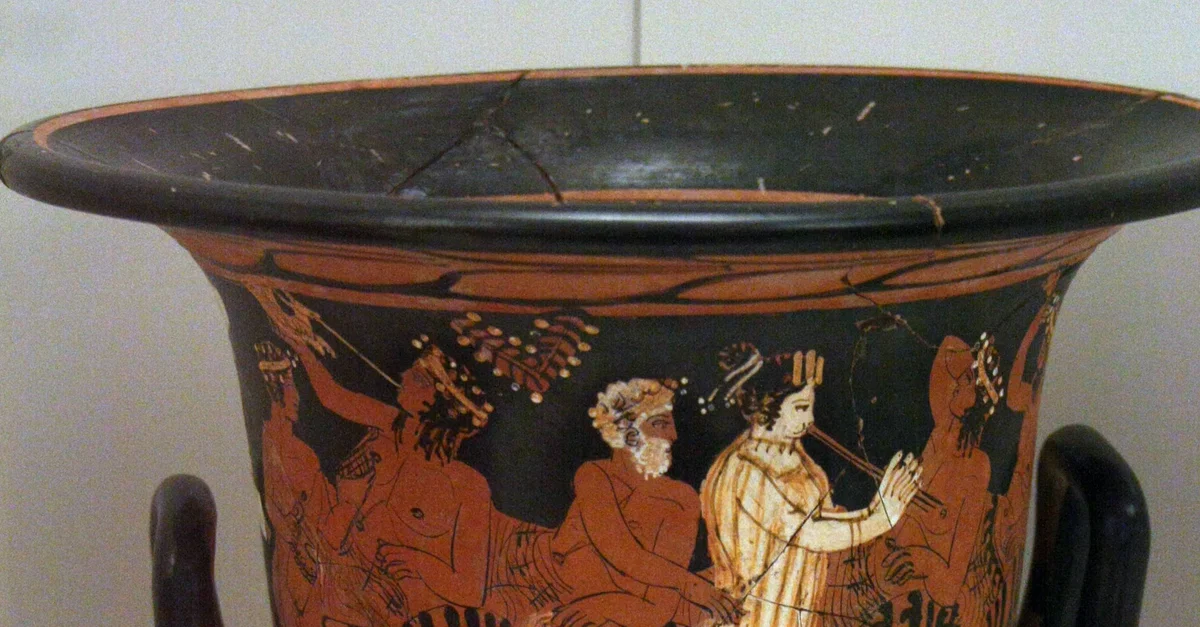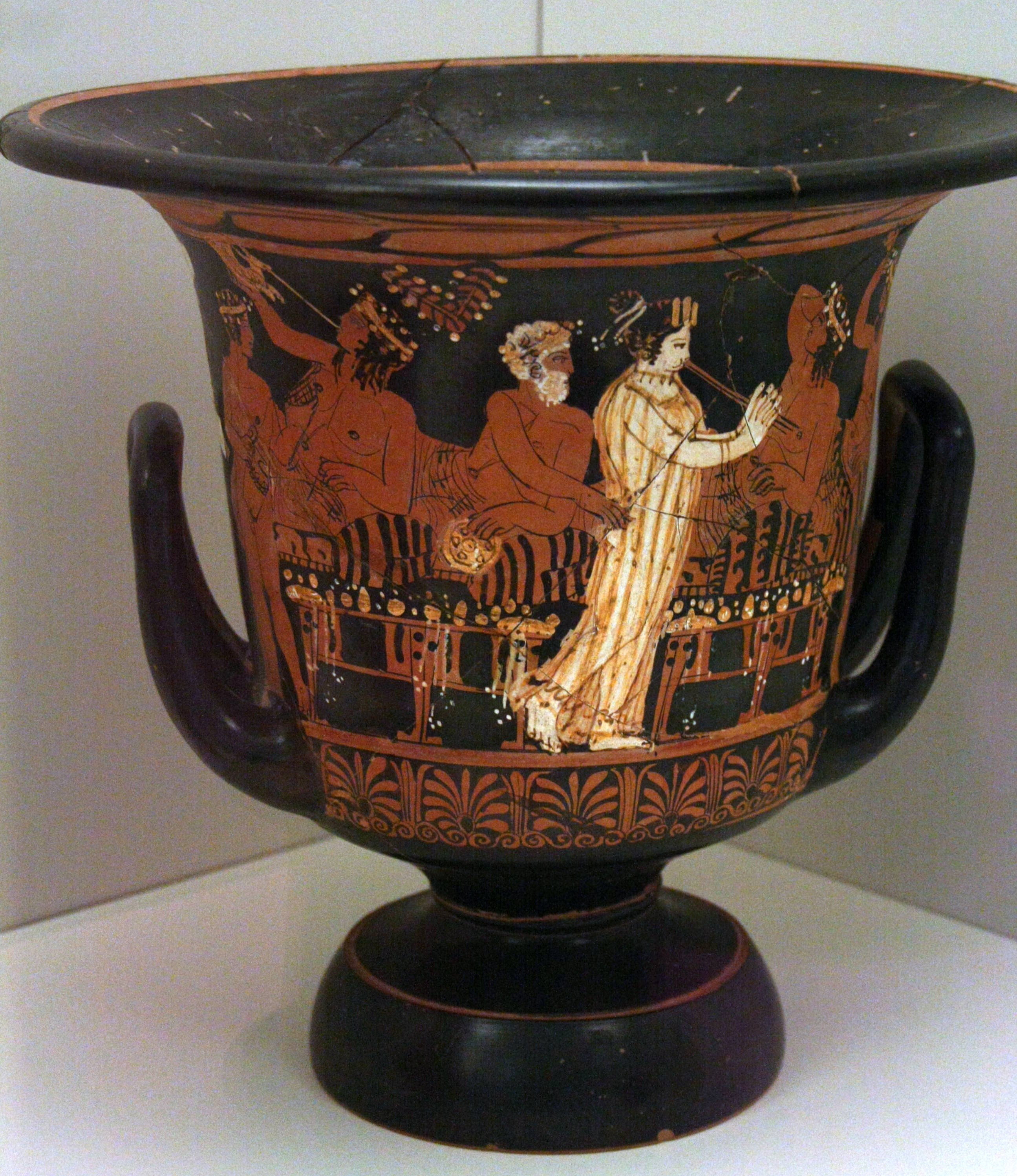 Attic red-figure calyx krater. Depicted here is a symposium scene, the male guests are reclining whilst the female aulos-player serenades them. By the Uppsala Painter. 11559, National Archaeological Museum, Athens