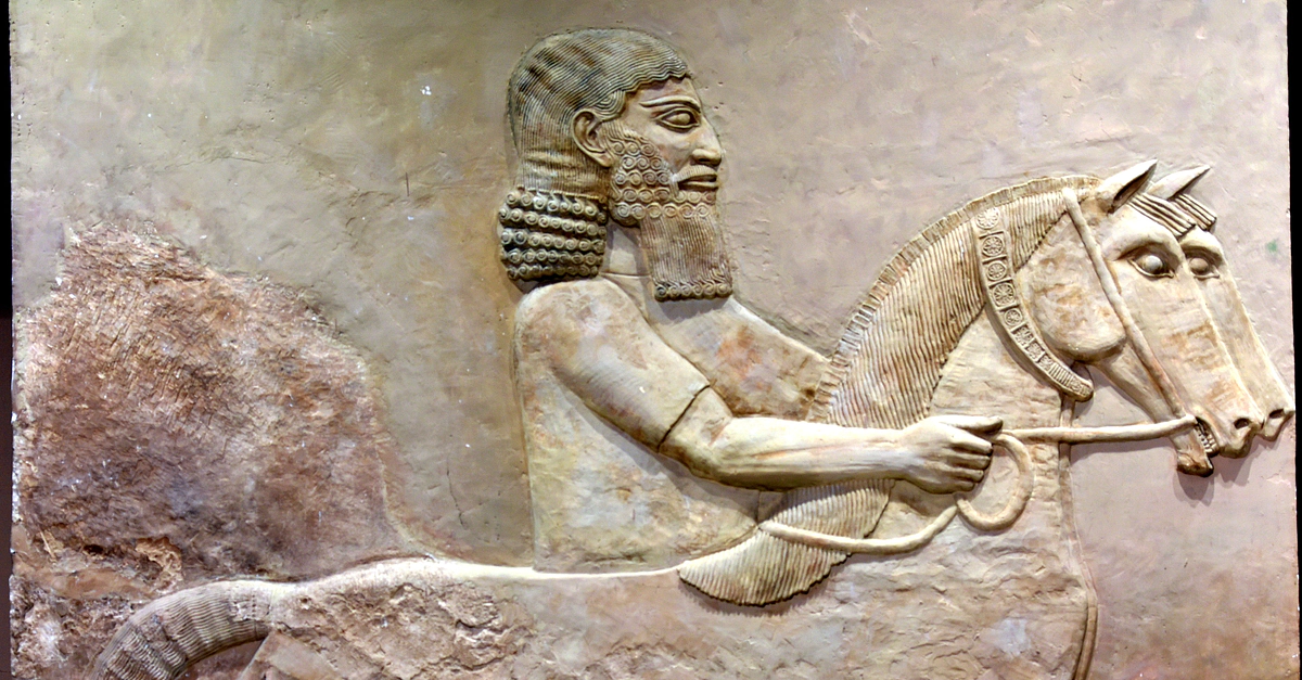An alabaster bas-relief of an Assyrian groom leading two horses forward, c. 710 BCE. Traces of the original paint can be seen on this relief. From the Royal Palace of Sargon II at Khorsabad, in modern-day Nineveh Governorate, Iraq. On display at Room X of the Iraqi Museum in Baghdad, Republic of Iraq.