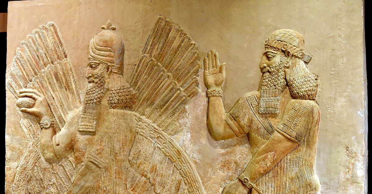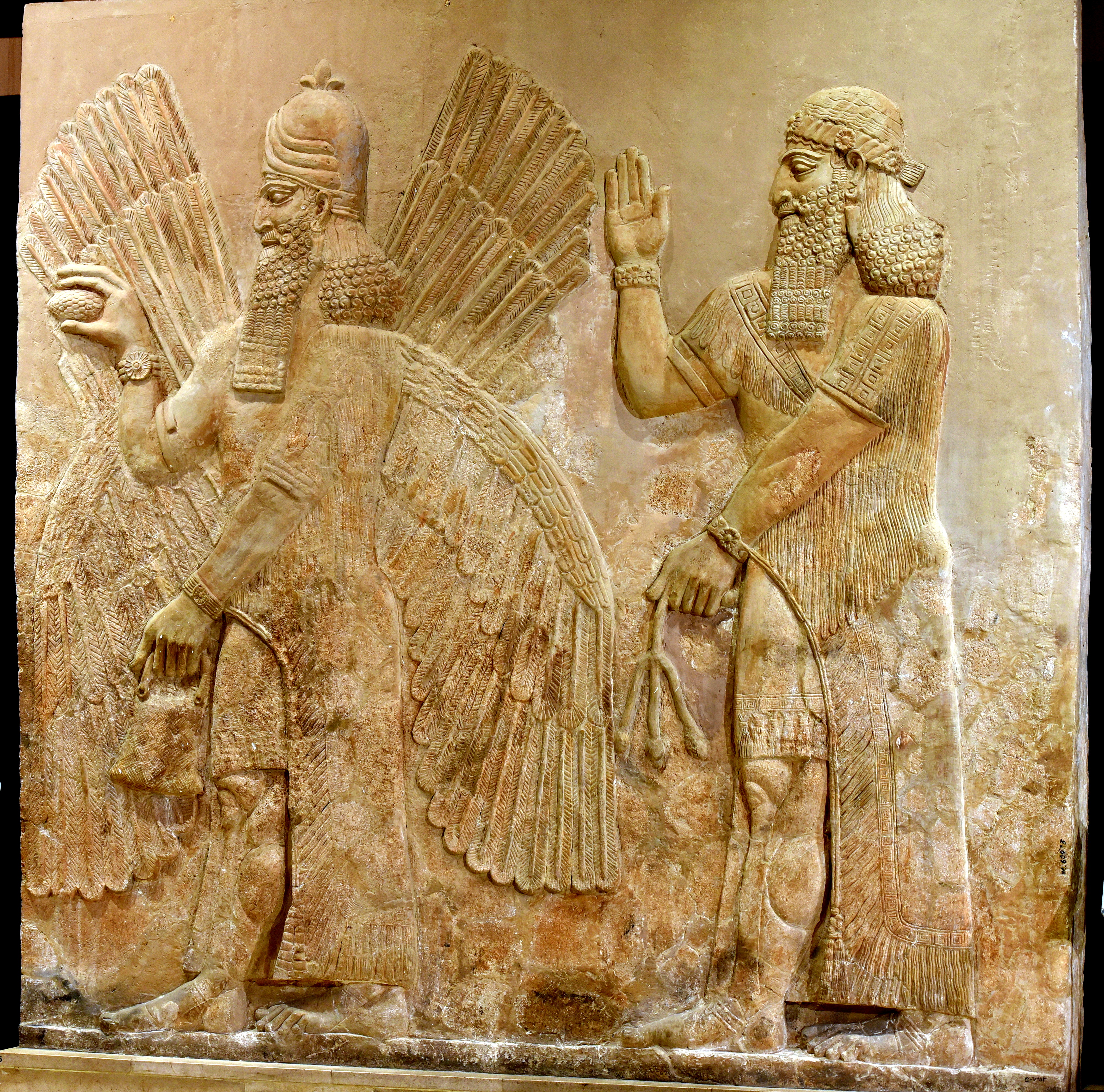 This alabaster bas-relief is probably part of a long religious ritual scene. The beaded male figure on the left has two pairs of wings and holds a pine cone in his right hand while the left hand holds a bucket. He wears a horned helmet. Behind him, a bearded Assyrian man, wearing a diadem and holding a branch of flowers, stands. Both wear long fringed robes, bracelets, armlets, sandals, and earrings. From the Royal Palace of Sargon II at Khorsabad, in modern-day Nineveh Governorate, Iraq. Circa 710 BCE. On display at Room X of the Iraqi Museum in Baghdad, Republic of Iraq.