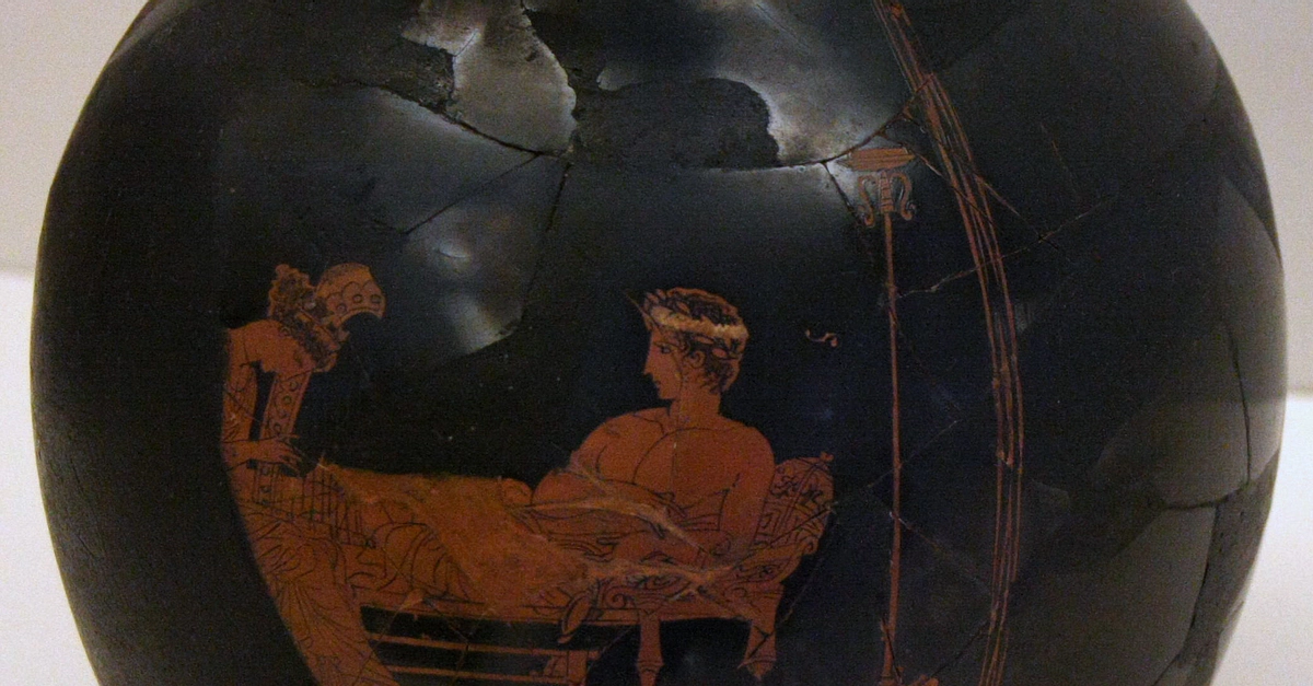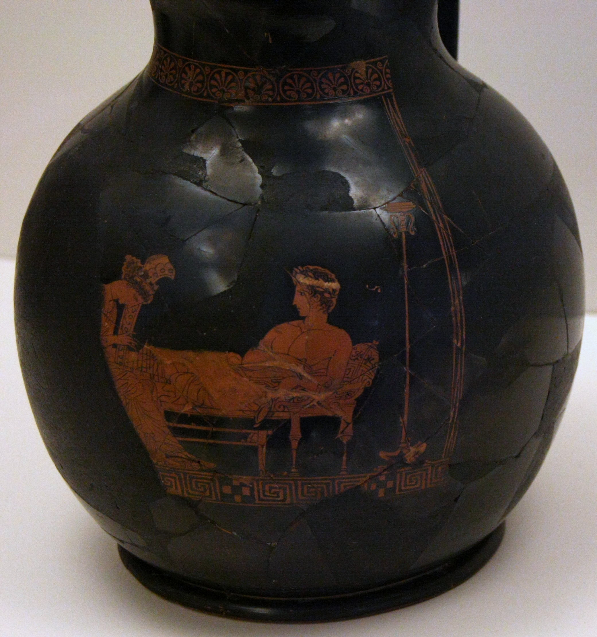 Red-figure chous. This symposium scene depicts a youthful symposiast reclining on a coach whilst a hetaira plays the harp. In was found in the Theatre of Dionysus, and is painted by the Eretria Painter, 425- 420 BCE.