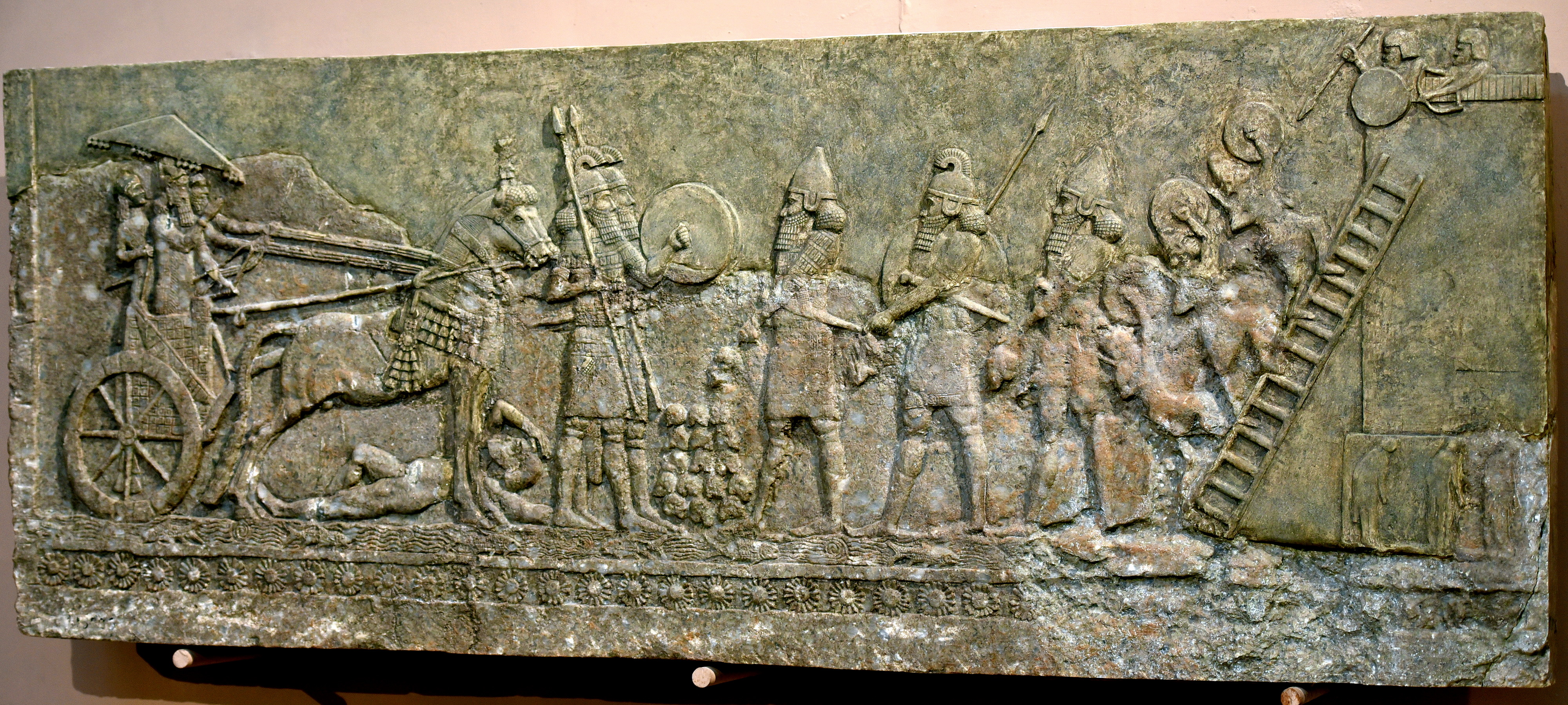This relief was part of Sargon II's throne, from Throne Hall VII of the Royal Palace of Sargon II at Khorsabad, in modern-day Nineveh Governorate, Iraq. Circa 710 BCE. The Assyrian king, Sargon II, stands in his royal chariot, below a parasol. He is accompanied by the charioteer and a guard. The chariot is driven by a pair of horses; a fallen, dying, and a naked enemy appears below the horses. At the middle, 5 Assyrian soldiers bring and pile a stack of enemies' beheaded heads. On the right, a group of Assyrian soldiers attacks a city's wall via a step ladder. At the right lower corner, 2 (probably impaled) naked enemies are depicted. On display at Room X of the Iraqi Museum in Baghdad, Republic of Iraq.