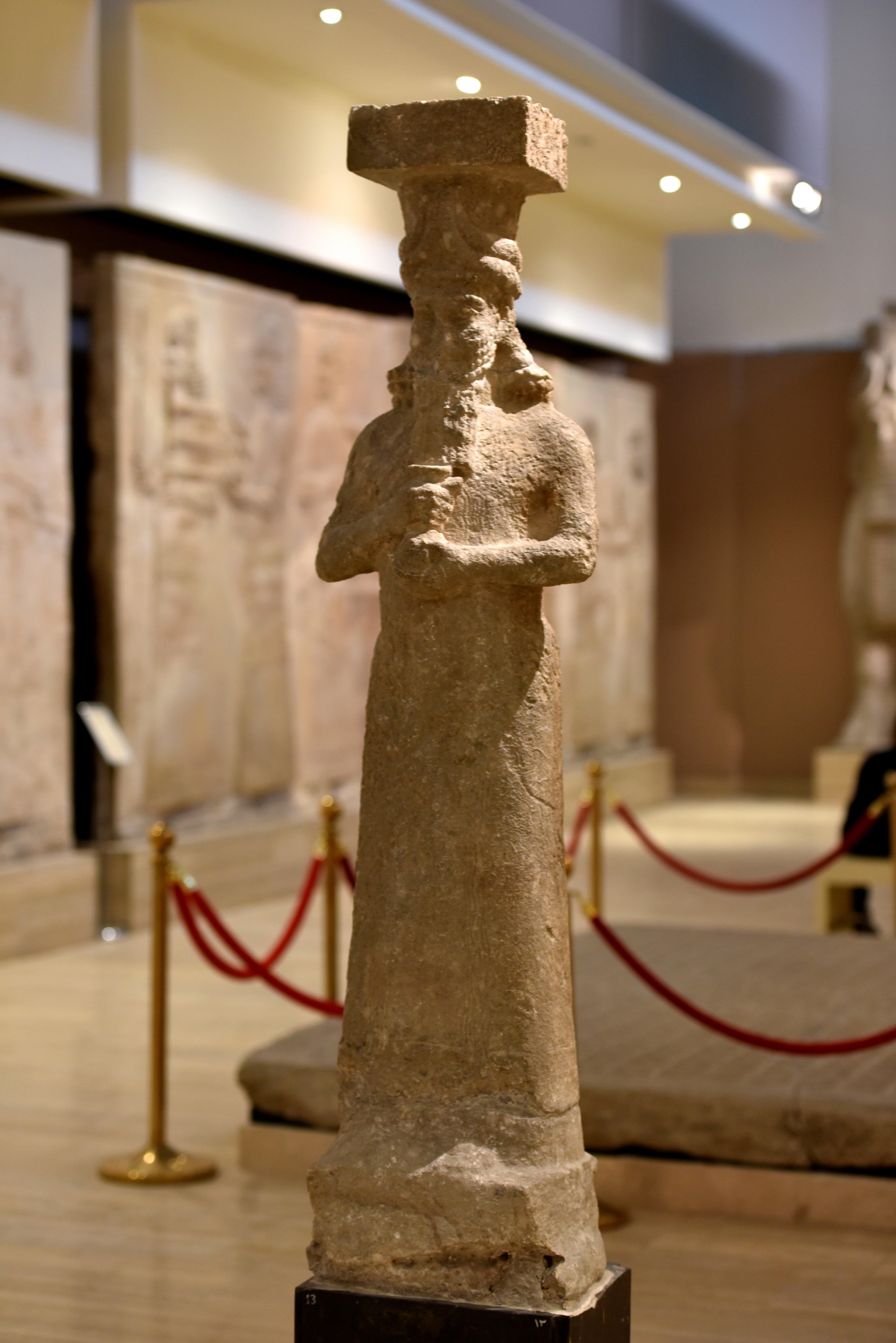 This statue of a minor deity (probably Ea, god of water and sea) stands and holds a vessel in his hands, from which water flows. It is one of a pair of statues which were found outside the entrance (in front of trees) to the Temple of Sin at Khorsabad (in modern-day Nineveh Governorate, Iraq). This statue was vandalized in April 2003 CE following the fall of Saddam's regime. They were probably not cult statues (because of their position outside the temple). In addition, the presence of a square block on their horned helmet suggests a supportive role; probably to put gold dishes during the New Year's festival. Reign of Sargon II, 722-705 BCE. They are on display in the heart of the Assyrian Gallery of the Iraq Museum in Baghdad, Republic of Iraq.