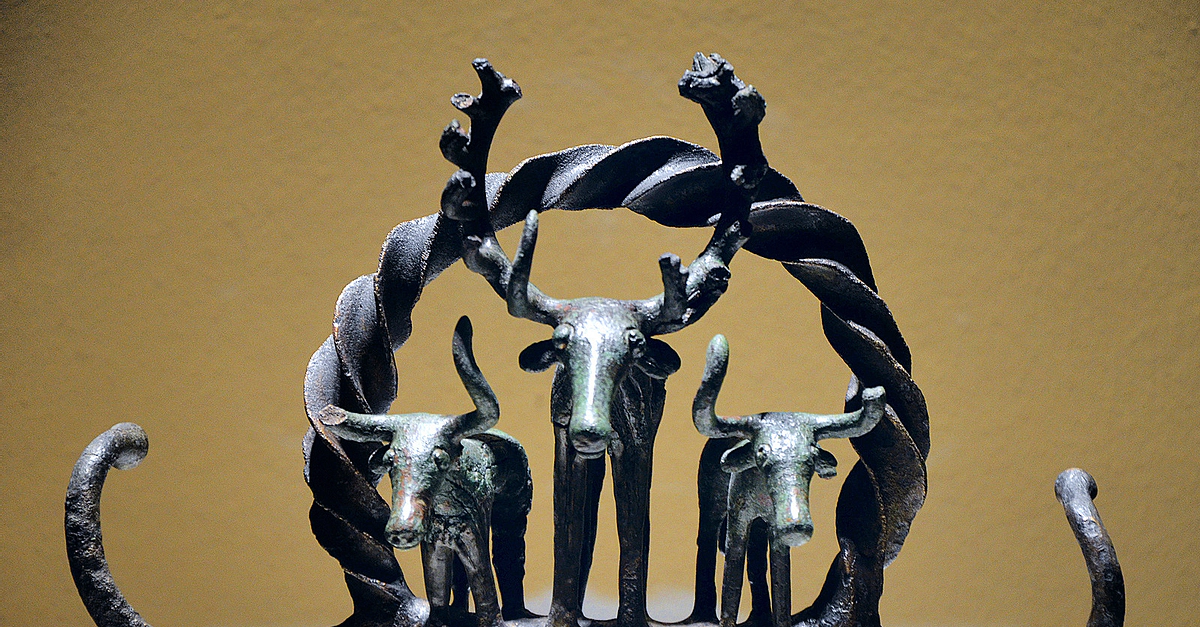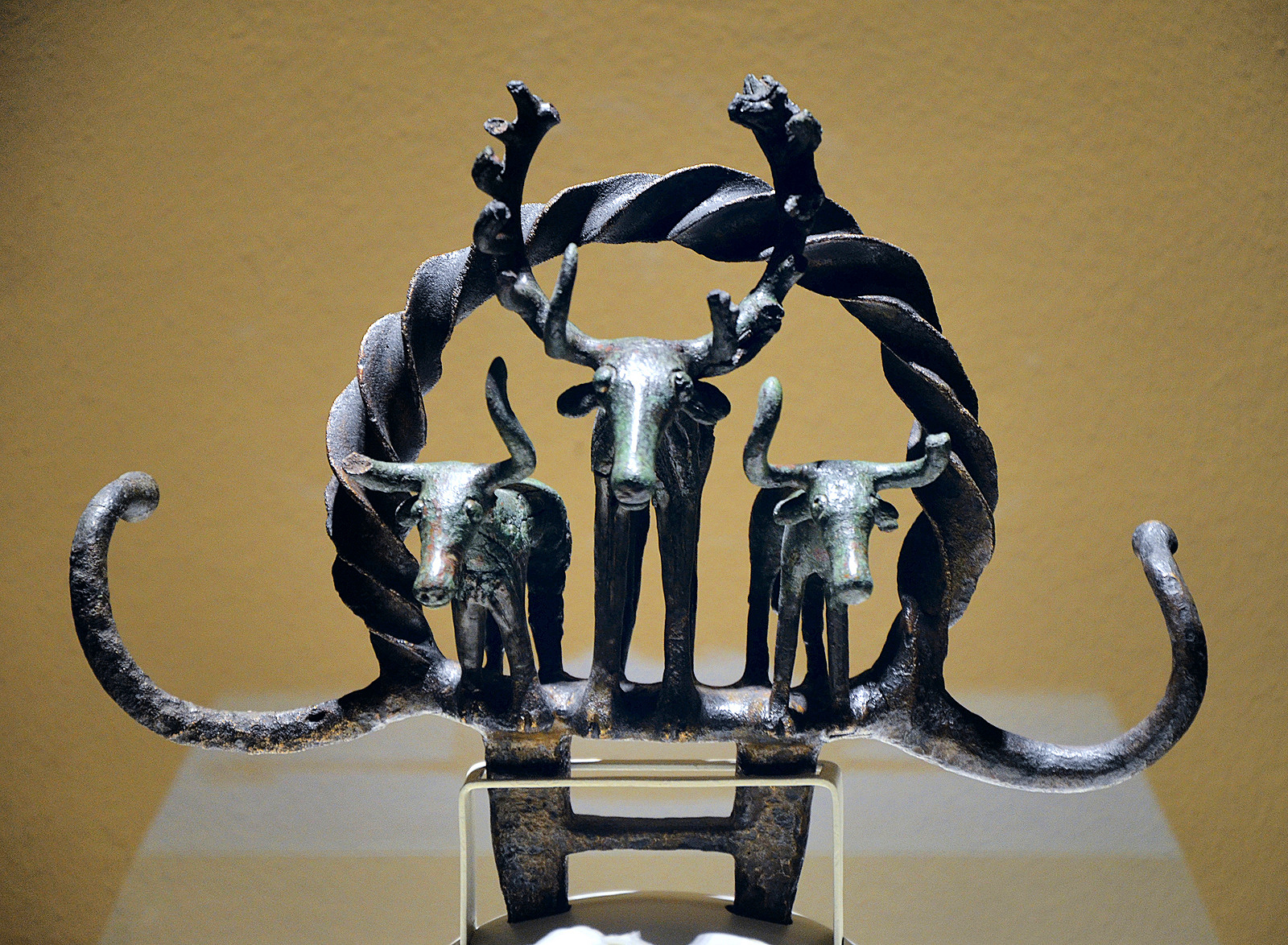 Bronze Age Hattian ceremonial standard known as "Sun Disks" with two bull and a deer, the sacred animals of the Hattians. These objects were used in religious ceremonies and were found in the royal tombs of Hattian times unearthed in Alacahöyük, 2500-2250 BCE. Museum of Anatolian Civilizations, Ankara (Turkey).