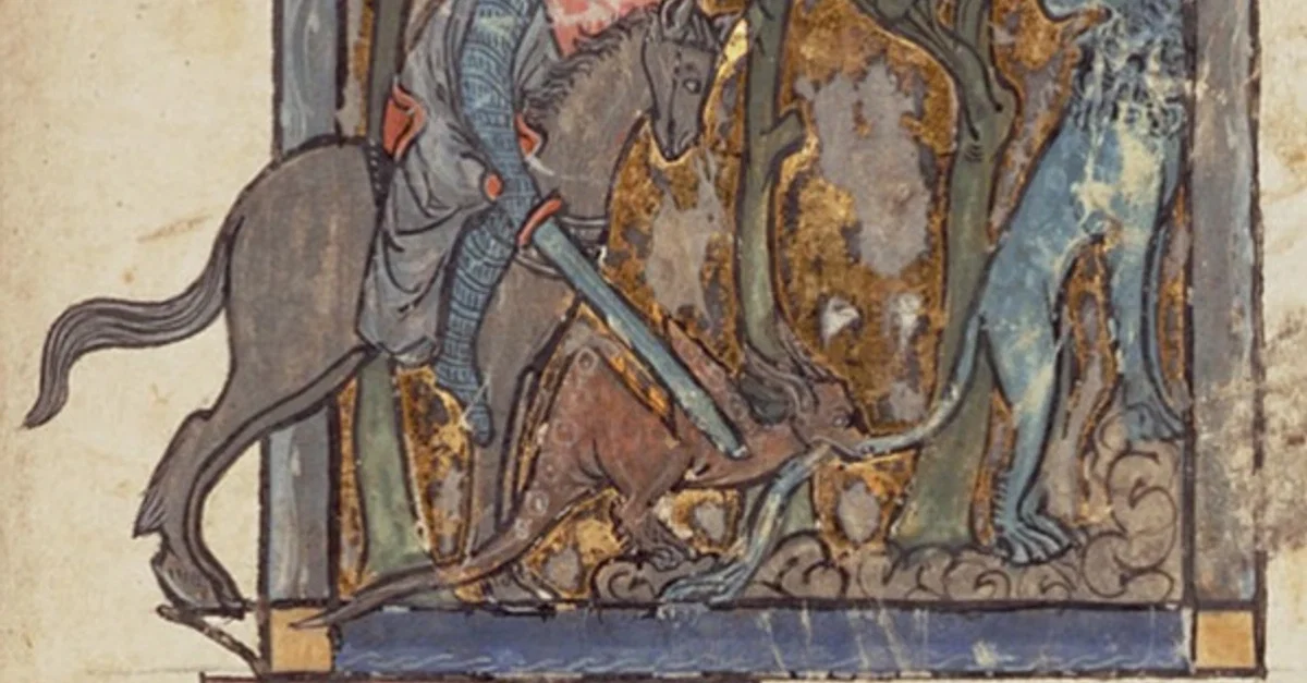 "Yvain rescues the lion", miniature from Garrett MS. No. 125 (ca. 1295 CE) kept at Manuscripts Division, Department of Rare Books and Special Collections, Princeton University Library