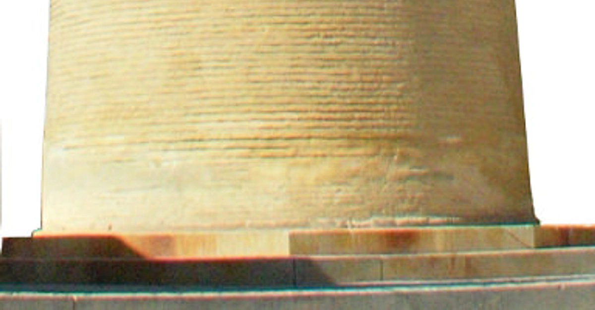 The Sarban ('Camel-driver') minaret at Isfahan (Jubareh area), Iran (1130-1155 CE). The shafts are decorated with alternate bands of decorative brick and blue tile work in geometric patterns, and two girdles of stalactite ornament. The horizontal bands of square Kufic inscriptions with hexagonal, octagonal and lozenge shaped patterns. The embellished cornices are composed of tile work and elegant brick mouqarnas.