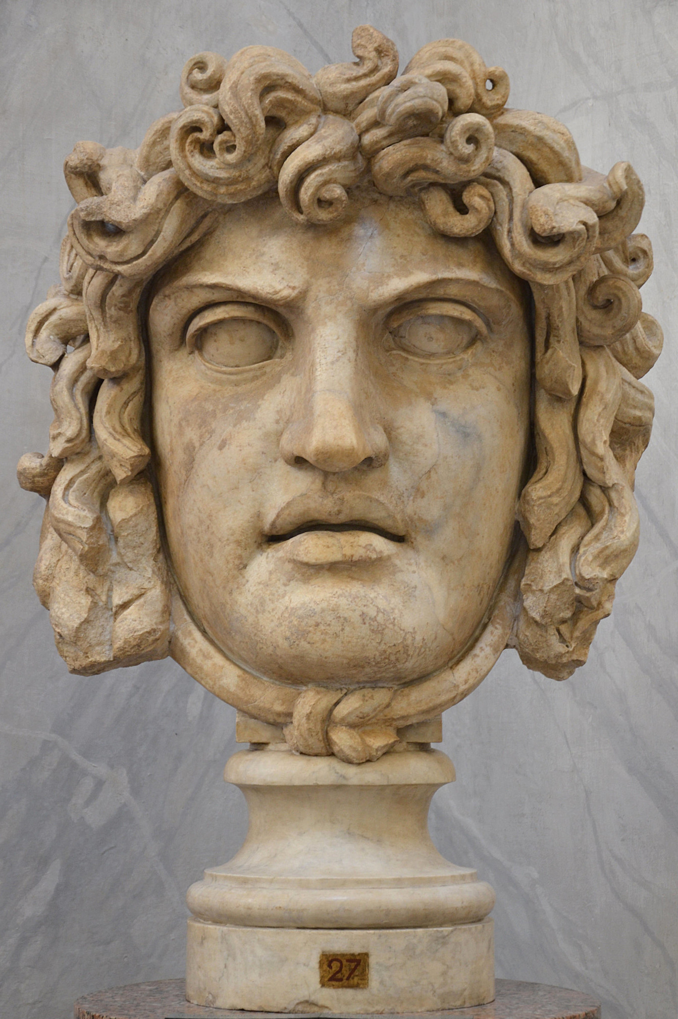 Over life-size marble mask of Medusa from the Temple of Venus and Roma in Rome, 2nd century CE. New Wing, Vatican Museums.