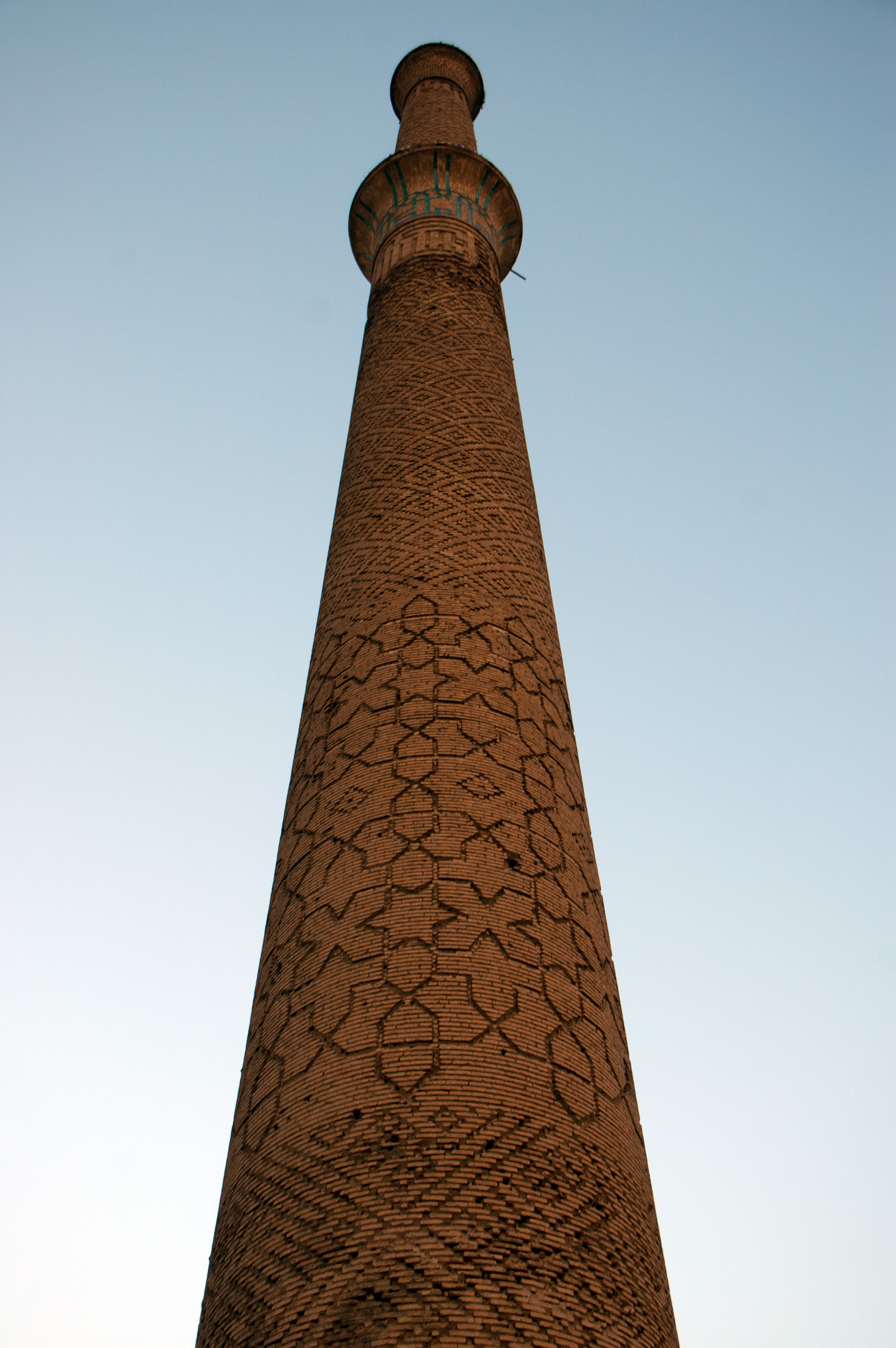 The minaret of the Ali Mosque, Isfahan, Iran. Erected during the reign of Seljuk sultan Sanjar (118-1157 CE). Decorated by two balconies. The shaft below the balconies embellished with interlocking stars in recess, altering to a diamond pattern at the top end, four bands of Kufic inscriptions, three of which are highlighted with glazed tiles.