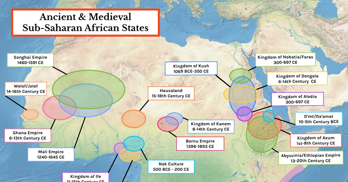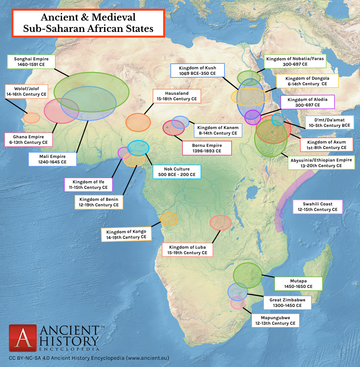 Cartwright, M. (2019, April 12). Map of Ancient & Medieval Sub-Saharan African States. World History Encyclopedia. https://www.worldhistory.org/image/10453/map-of-ancient--medieval-sub-saharan-african-state/