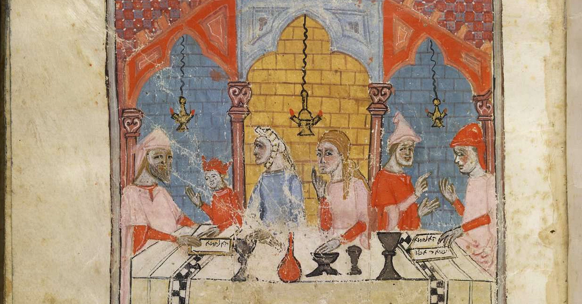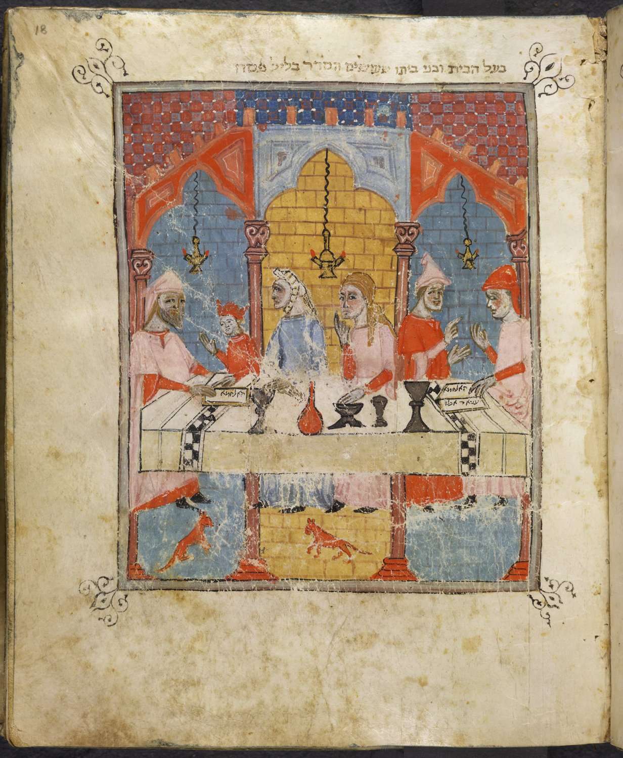 An illustration of a Jewish family sitting around a Seder table and discussing the Haggadah during Passover. The image comes from a "Sister Haggadah", made in 14th Century CE Barcelona, Spain. The manuscript is now part of the collection of the British LIbrary in London, UK.
