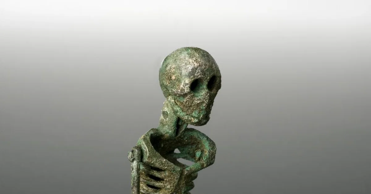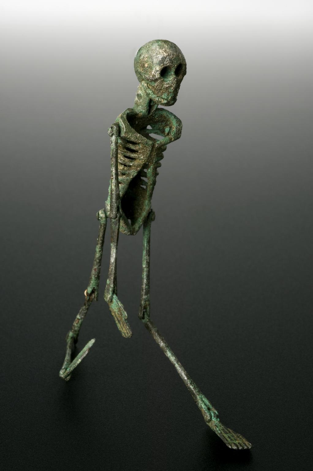 A little over 110 mm (4.3 inches) high, this small bronze figure of a skeleton is a "memento mori" (Latin for "Remember you must die"). These figures were handed out at gatherings and celebrations, as a reminder of the threat of mortality which loomed even during times of festivity. This example is unusual because its left arm was used to replace its missing right leg. Made c. 199 BCE - 500 CE, the figure is now a part of the collection of the Science Museum in London, UK.