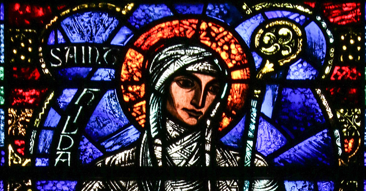 A depiction of St. Hilda of Whitby (614 - 680 CE) from one of the stained glass windows in Grace Cathedral, San Francisco, US.