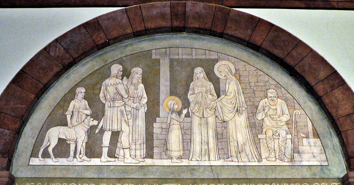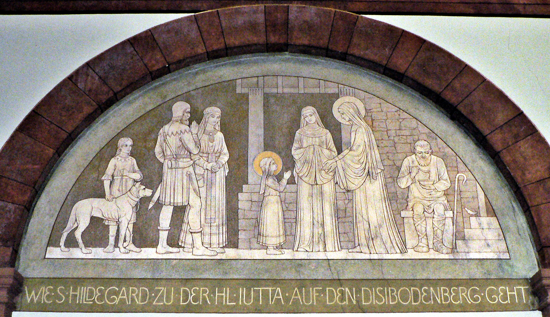 A depiction of St. Hildegard of Bingen (1098 - 1179 CE) going to the monastery at Disibodenberg, where she meets St. Jutta of Sponheim, who was to be her tutor. From the Benedictine Abbey of St. Hildegard in Eibingen, Germany. The monastic community was originally founded by St. Hildegard in 1165, although it was temporarily dissolved during the 19th Century.