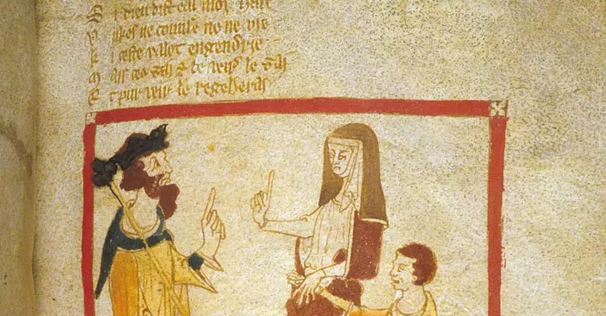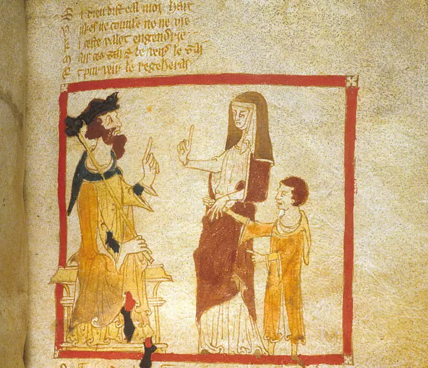 A detail of an illustration from a 14th Century CE manuscript of Roman de Brut, a legendary history of Britain by the Norman poet Wace (c. 1110 - c. 1170 CE). The young Merlin is depicted, alongside his mother, approaching King Vortigern (c. 5th Century CE). The manuscript, written in Anglo-Norman, is now part of the collection of the British Library in London, UK.