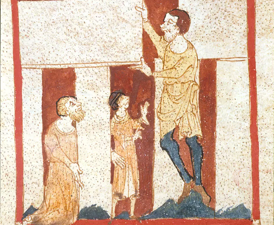 A detail of a 14th Century CE illustration of Roman de Brut, a legendary history by the Norman poet Wace (c. 1110 - c. 1170 CE). Merlin is depicted directing the giants to build Stonehenge. The Anglo-Norman manuscript containing this illustration is now a part of the collection of the British Library, London, UK.