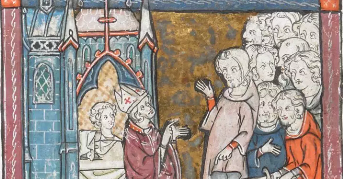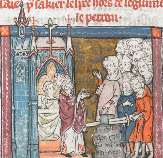An illustration of King Arthur drawing the enchanted sword Excalibur from the sword. From the Vulgate Cycle manuscript (1316 CE) in the British Library, London.