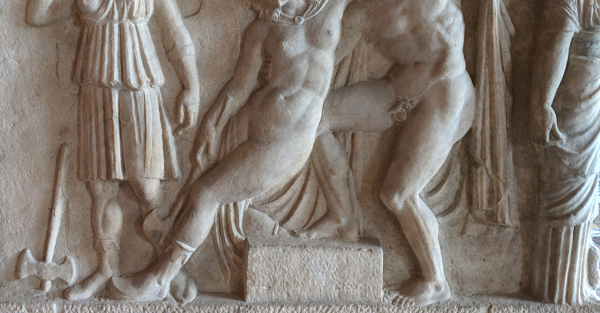 Achilles holding the Amazon Queen Penthesilea, whom he fell in love with at the moment he killed her during the Trojan War. Relief from the side of a sarcophagus, c. 180 CE, discovered in Thessaloniki, Greece. Louvre Museum, Paris, France (LP 2584, No usuel Ma 2119).