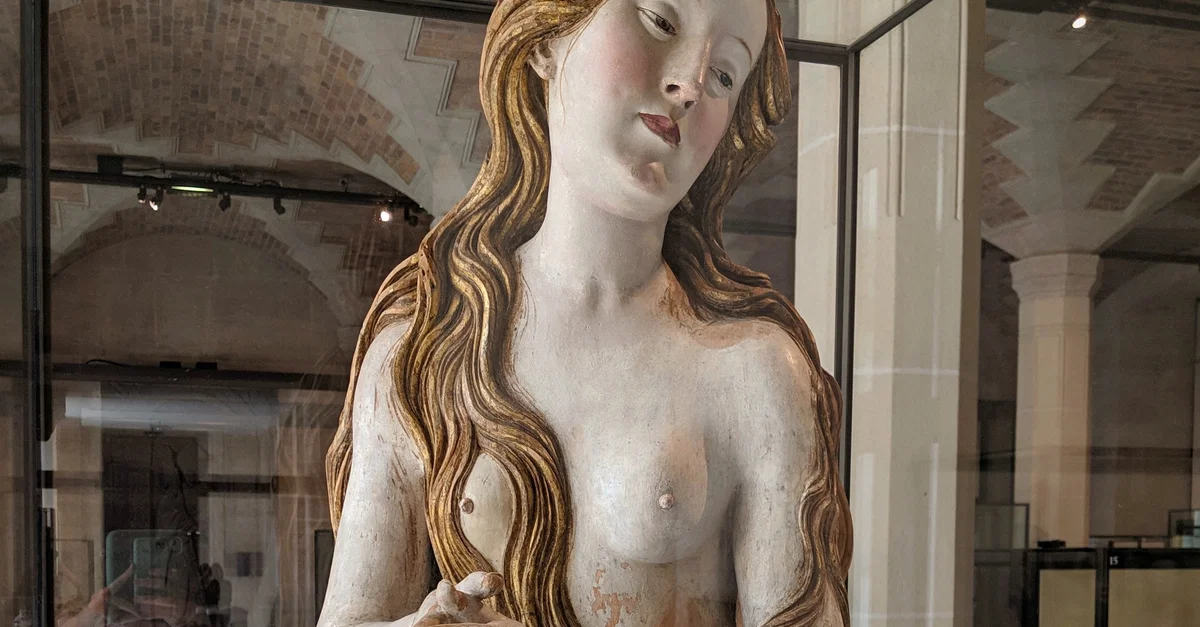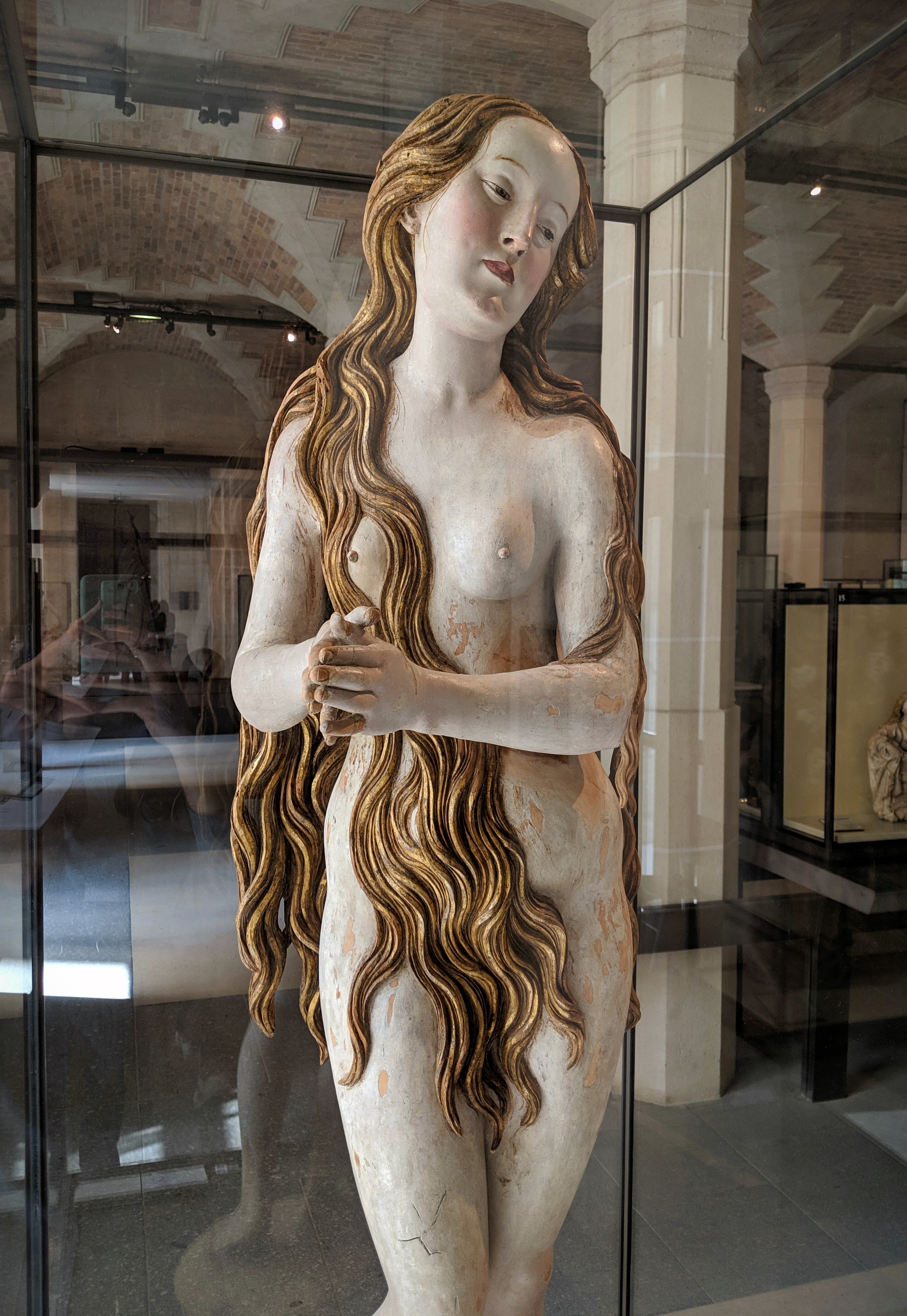 Saint Mary Magdalene by Gregor Erhart around 1515-1520 CE. Sculpted in Linden wood, this statue shows the naked Mary Magdalene repenting her sins in the Grotto of Sainte-Baume (France), where she died and was believed to have been transported to paradise by angels. Louvre Museum, Paris, Fance. R.F.1338