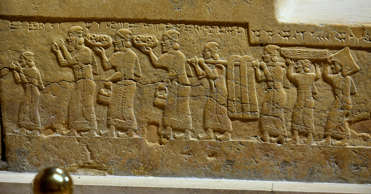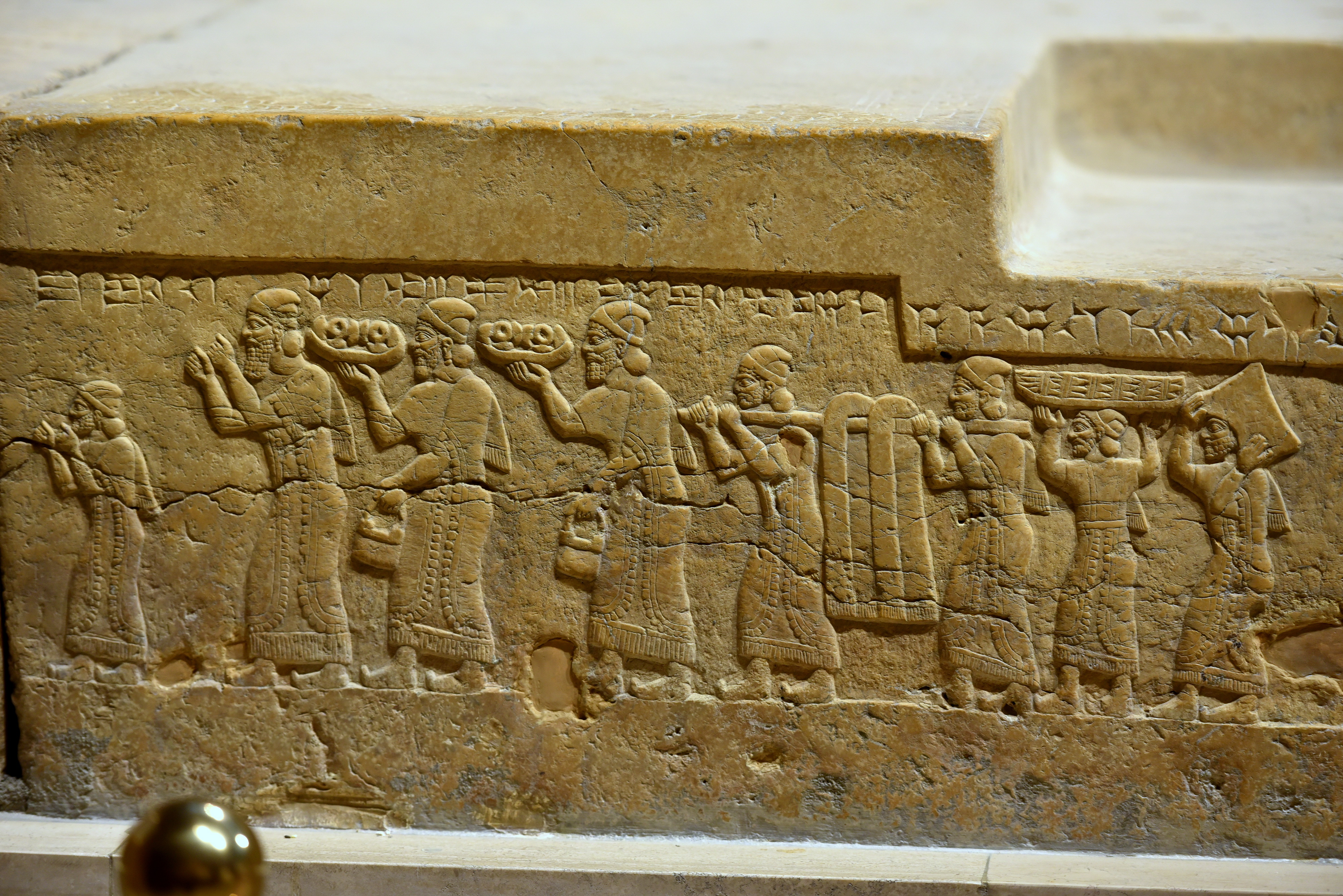 This scene is part of a long tributary one where Shalmaneser III (r. 858-824 BCE) receives tribute from Qalparunda (c. mid 9th Century BCE) of the Land of Unqi (a Luwian Syri-Hittite state, also known as Pattin). The procession is headed by a bearded male figure (probably Qalparunda). Before him, a smaller bearded male, probably his son, appears. Both raise their hands in a homage or submission gesture. The tribute is composed of two trays of earrings (and buckets), a pair of fringed robes (slung on a pole between two men), an object (probably a wicker shield), and a large ingot of metal. This dais was found in the eastern end of the throne room (T1) at Fort Shalmaneser in the city of Nimrud (in modern-day Nineveh Governorate, Iraq) in 1962 CE. The front and sides of the dais were carved in relief depicting various tributary scenes. The dais was completed around 846-845 BCE (and that would be the king's 13th year of reign). During the ransacking of the Iraq Museum in April 2003 CE, this object was not vandalized and remained intact. It is on display at the Assyrian Gallery of the Iraq Museum in Baghdad, Republic of Iraq.