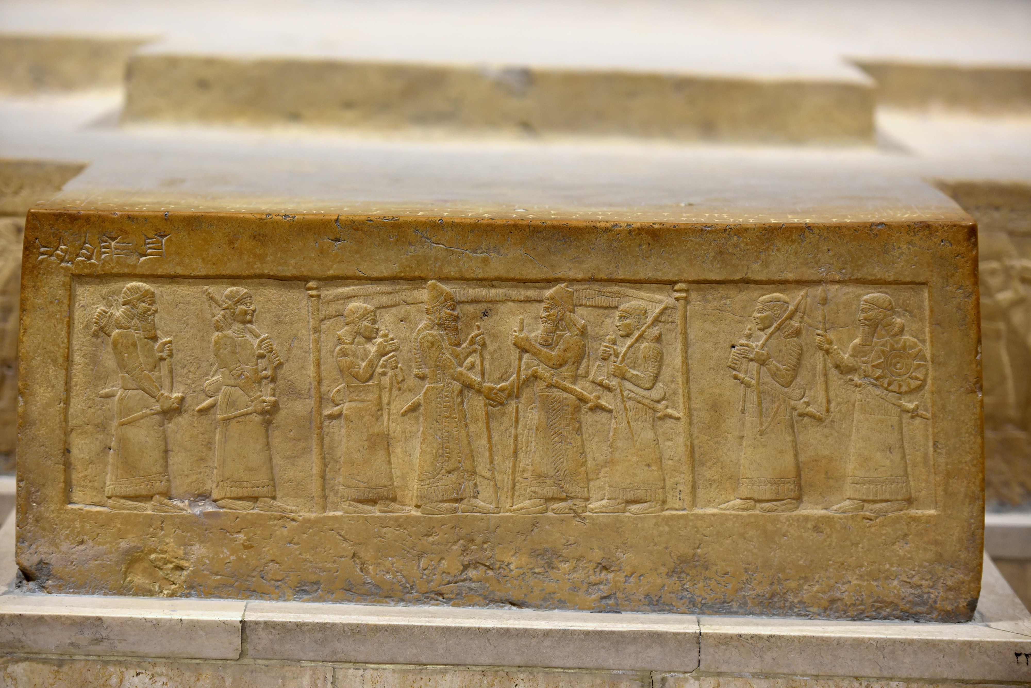 The front panel of this dais depicts Shalmaneser III (r. 858-824 BCE), (on the right) handshaking Marduk-zakir-shumi (r. 855 - 819 BCE) (left), king of Babylon. Both are surrounded by guards and stand below a fringed canopy supported by poles. The scene commemorates Shalmaneser's support of Marduk-zakir-sumi against his rebellious brother, Marduk-bel-usati and the ascent of Marduk-zaki-shumi to the throne. Its place on the dais reflects its importance as one of the great achievements of Shalmaneser III. This dais was found in the eastern end of the throne room (T1) at Fort Shalmaneser in the city of Nimrud (in modern-day Nineveh Governorate, Iraq) in 1962 CE. The front and sides of the dais were carved in relief depicting various tributary scenes. The dais was completed around 846-845 BCE (and that would be the king's 13th year of reign). During the ransacking of the Iraq Museum in April 2003 CE, this object was not vandalized and remained intact. It is on display at the Assyrian Gallery of the Iraq Museum in Baghdad, Republic of Iraq.
