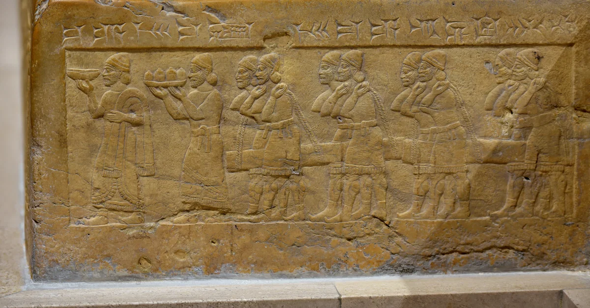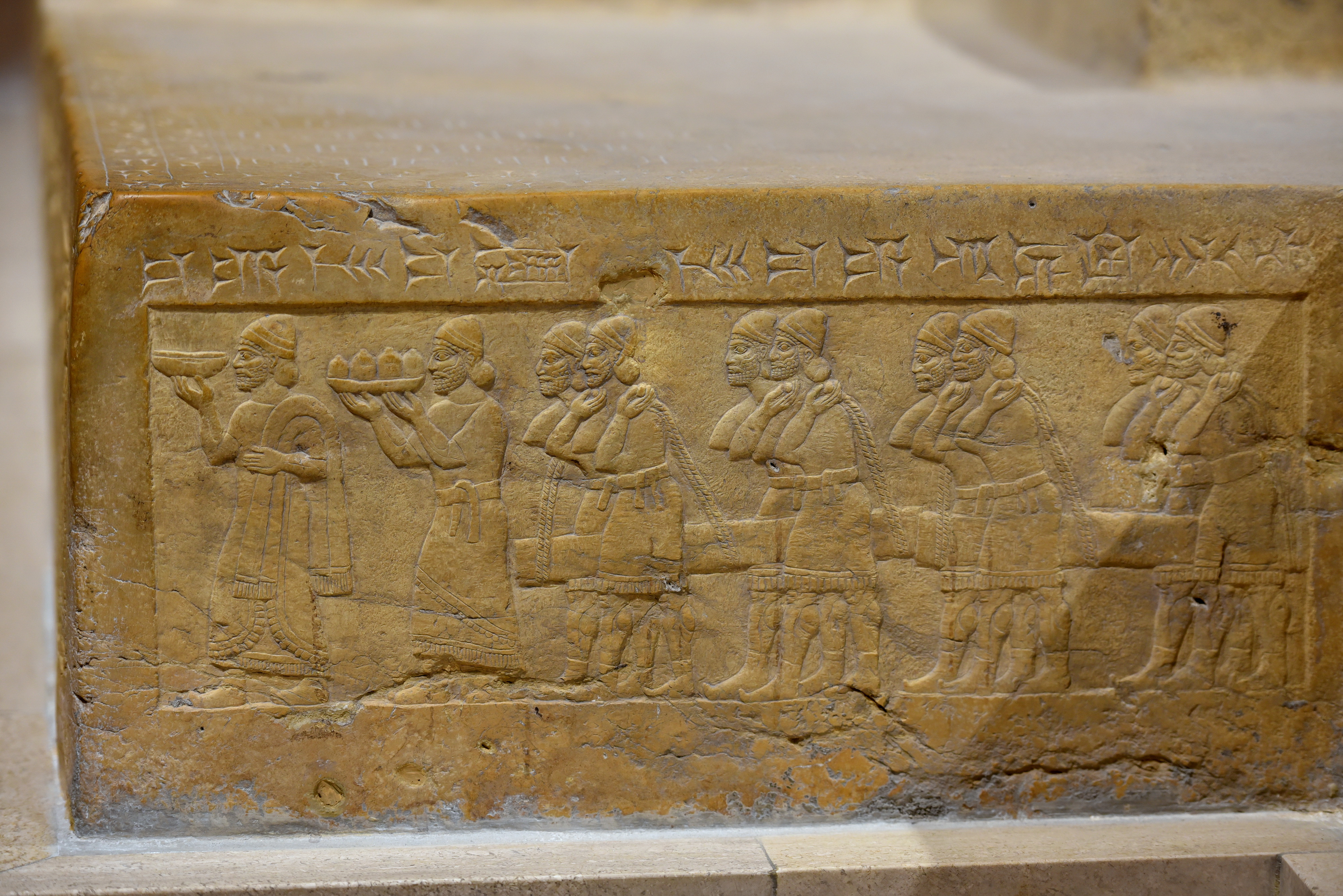 This scene is part of a long tributary one where Shalmaneser III (r. 858-824 BCE) receives tribute from Qalparunda of the Land of Unqi (a Luwian Syri-Hittite state, also known as Pattin). On the left, there are two figures, of whom the first carries a bowl in his right hand and a fringed cloth over his shoulder, reminiscent of the napkin carried by the Assyrian royal cup-bearer. The second man carries a tray of small objects with rounded tops, perhaps pyxides; he wears no outer garment, and there is an indication of a diagonal border on the fringe of his long tunic, which is gathered at the waist by a knotted belt with the ends hanging down. The same belt is worn over a knee-length tunic by the eight porters who follow. These are arranged in four pairs, each pair supporting one end of a large beam slung between them by rope slings which pass over their shoulders. This dais was found in the eastern end of the throne room (T1) at Fort Shalmaneser in the city of Nimrud (in modern-day Nineveh Governorate, Iraq) in 1962 CE. The front and sides of the dais were carved in relief depicting various tributary scenes. The dais was completed around 846-845 BCE (and that would be the king's 13th year of reign). During the ransacking of the Iraq Museum in April 2003 CE, this object was not vandalized and remained intact. It is on display at the Assyrian Gallery of the Iraq Museum in Baghdad, Republic of Iraq.