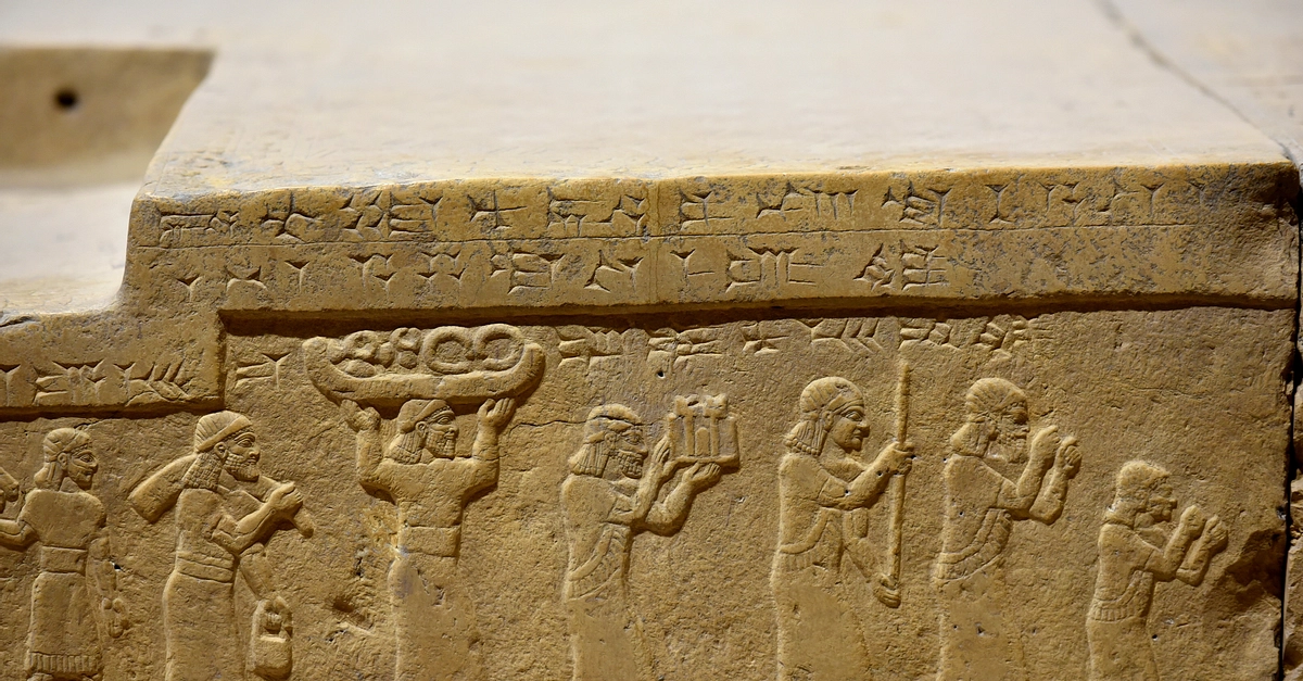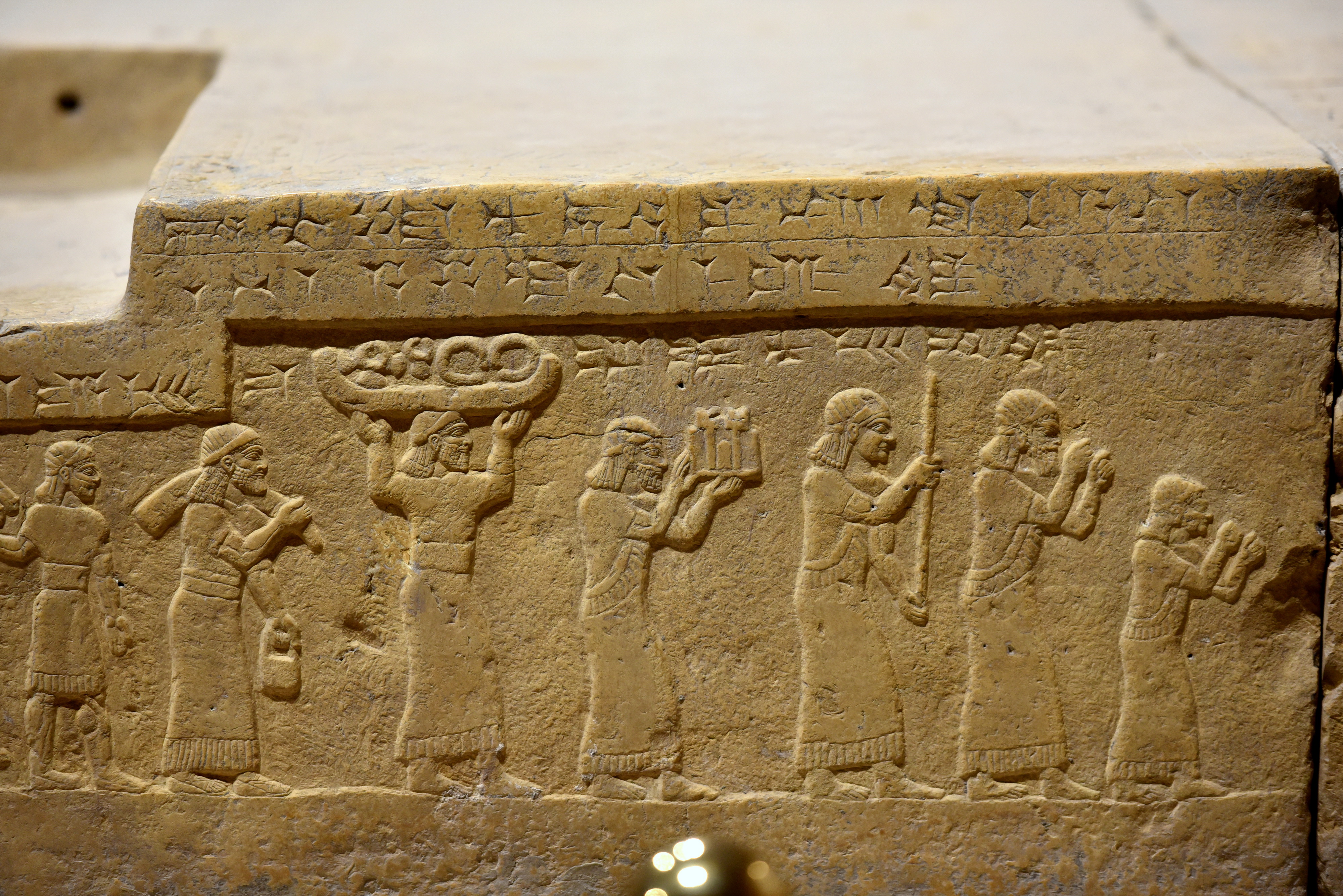 This scene is part of a long tributary one where the Shalmaneser III (r. 858 - 824 BCE) receives Chaldean tribute from Musallim-Marduk, son of Ukani. The procession is headed by a bearded male figure (probably the prince). Before him, a smaller male figure (child), probably his son, appears. Both raise their hands in a homage or submission gesture. They are followed by a chamberlain bearing his staff of office, a second attendant with a model of his city in token of his submission, and then two tribute-bearers and a groom. The first tribute-bearer carries on his head a large tray loaded with objects (cruciform and pendant earrings and torque armlets, presumably of gold or silver). The second man carries has a tusk of ivory over his shoulder and a metal bucket in his left hand. On the extreme left, a groom is shown leading a horse (not shown here). The hair of all the figures is dressed in approximately the Assyrian fashion and bound with a fillet, narrowing towards a knot at the back from which the ends hang down; the ends are not always shown but the difference does not appear to be significant, since the prince and the groom are identically represented in this respect. This dais was found in the eastern end of the throne room (T1) at Fort Shalmaneser in the city of Nimrud (in modern-day Nineveh Governorate, Iraq) in 1962 CE. The front and sides of the dais were carved in relief depicting various tributary scenes. The dais was completed around 846-845 BCE (and that would be the king's 13th year of reign). During the ransacking of the Iraq Museum in April 2003 CE, this object was not vandalized and remained intact. It is on display at the Assyrian Gallery of the Iraq Museum in Baghdad, Republic of Iraq.
