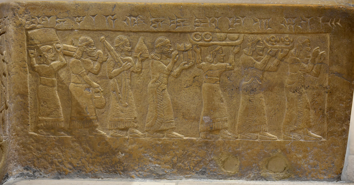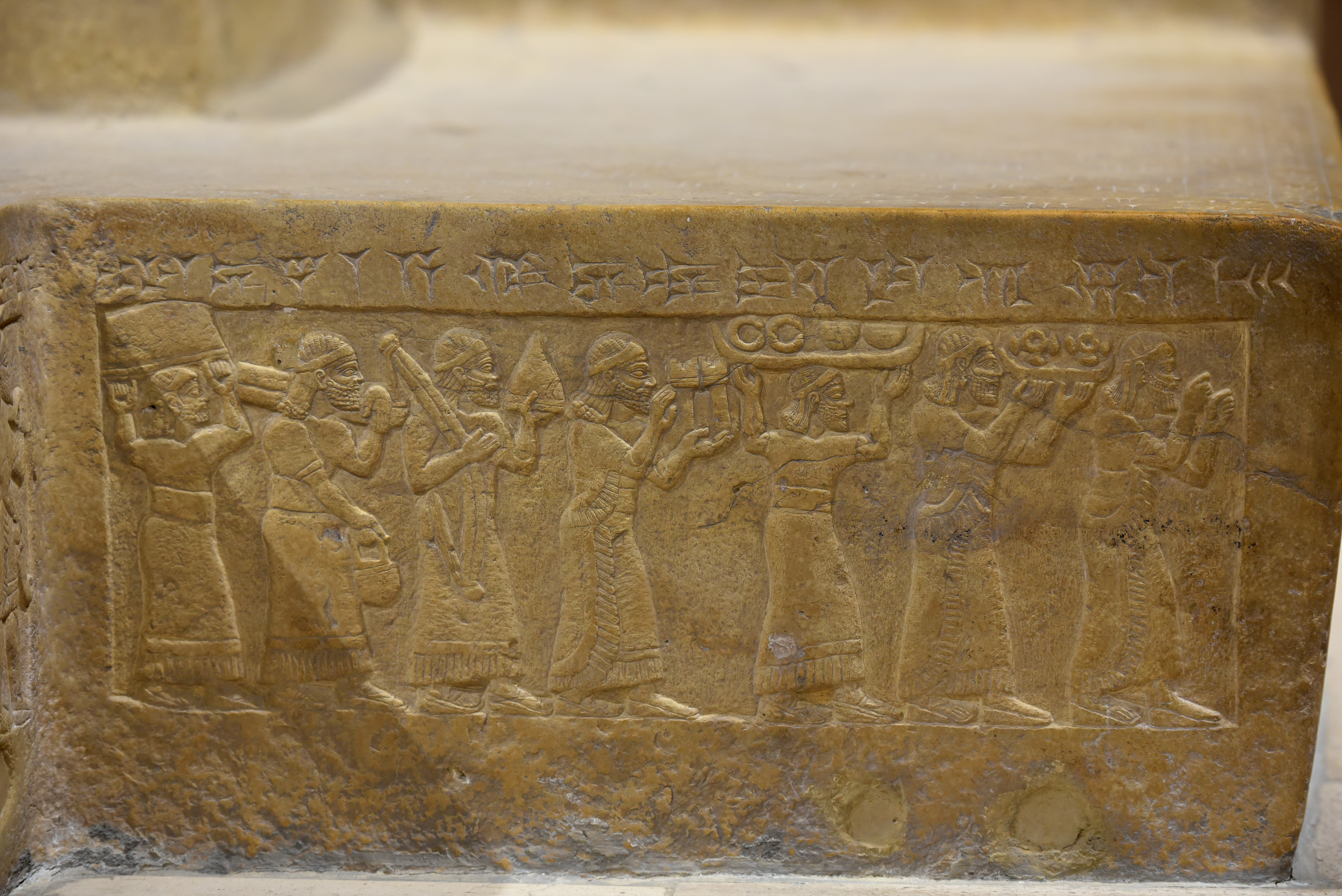 This scene is part of a long tributary one where the Shalmaneser III (r. 858-824 BCE) receives Chaldean tribute from Musallim-Marduk, son of Ukani. On this panel, there are seven figures. The leading figure of the procession carries no offering and is probably an official of the tributary city. He is followed by two tribute-bearers, one with a small tray of the cruciform objects tentatively identified as ear-rings, the second with a larger tray of metal bowls and torques. Then, comes a model city, followed by a pair of bows and a helmet, two balks of wood and a round-bottomed metal bucket, and a large two-handled cauldron. This dais was found in the eastern end of the throne room (T1) at Fort Shalmaneser in the city of Nimrud (in modern-day Nineveh Governorate, Iraq) in 1962 CE. The front and sides of the dais were carved in relief depicting various tributary scenes. The dais was completed around 846-845 BCE (and that would be the king's 13th year of reign). During the ransacking of the Iraq Museum in April 2003 CE, this object was not vandalized and remained intact. It is on display at the Assyrian Gallery of the Iraq Museum in Baghdad, Republic of Iraq.