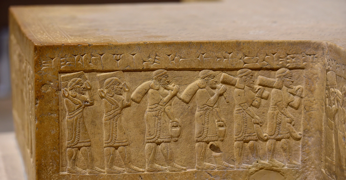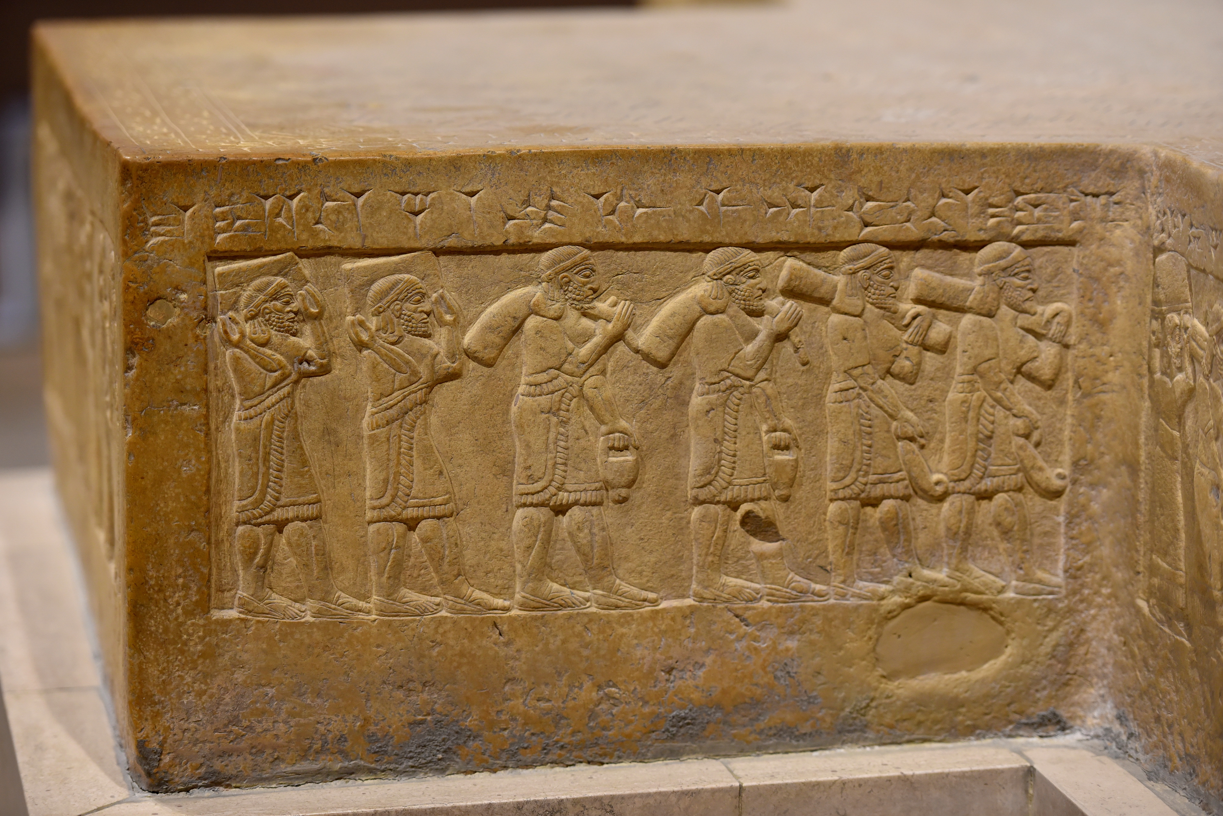 This scene is part of a long tributary one where the Shalmaneser III (r. 858-824 BCE) receives Chaldean tribute from Musallim-Marduk, son of Ukani. This is the end of the procession. The first pair of men carry shallow vessels with high looped handles and balks of wood of a different shape from those seen earlier; the two types presumably represent the ebony and the mulberry wood of the inscription. The second pair of men carry tusks of ivory over their shoulders and button-based buckets in their hands. The last pair also bear objects (probably elephants hide). This dais was found in the eastern end of the throne room (T1) at Fort Shalmaneser in the city of Nimrud (in modern-day Nineveh Governorate, Iraq) in 1962 CE. The front and sides of the dais were carved in relief depicting various tributary scenes. The dais was completed around 846-845 BCE (and that would be the king's 13th year of reign). During the ransacking of the Iraq Museum in April 2003 CE, this object was not vandalized and remained intact. It is on display at the Assyrian Gallery of the Iraq Museum in Baghdad, Republic of Iraq.