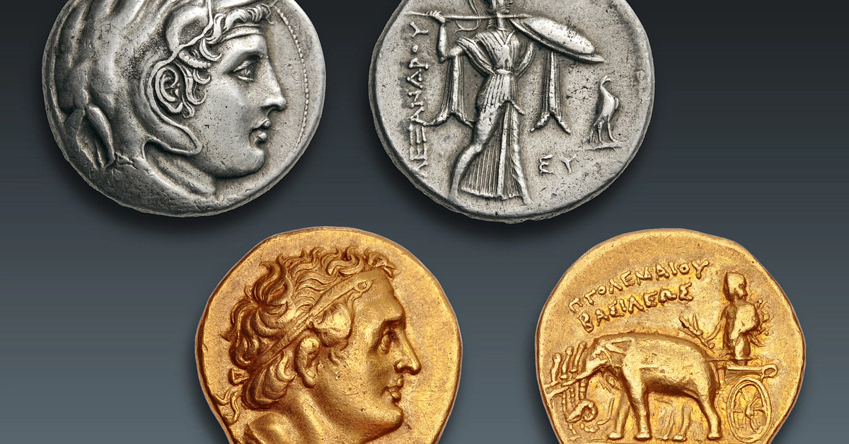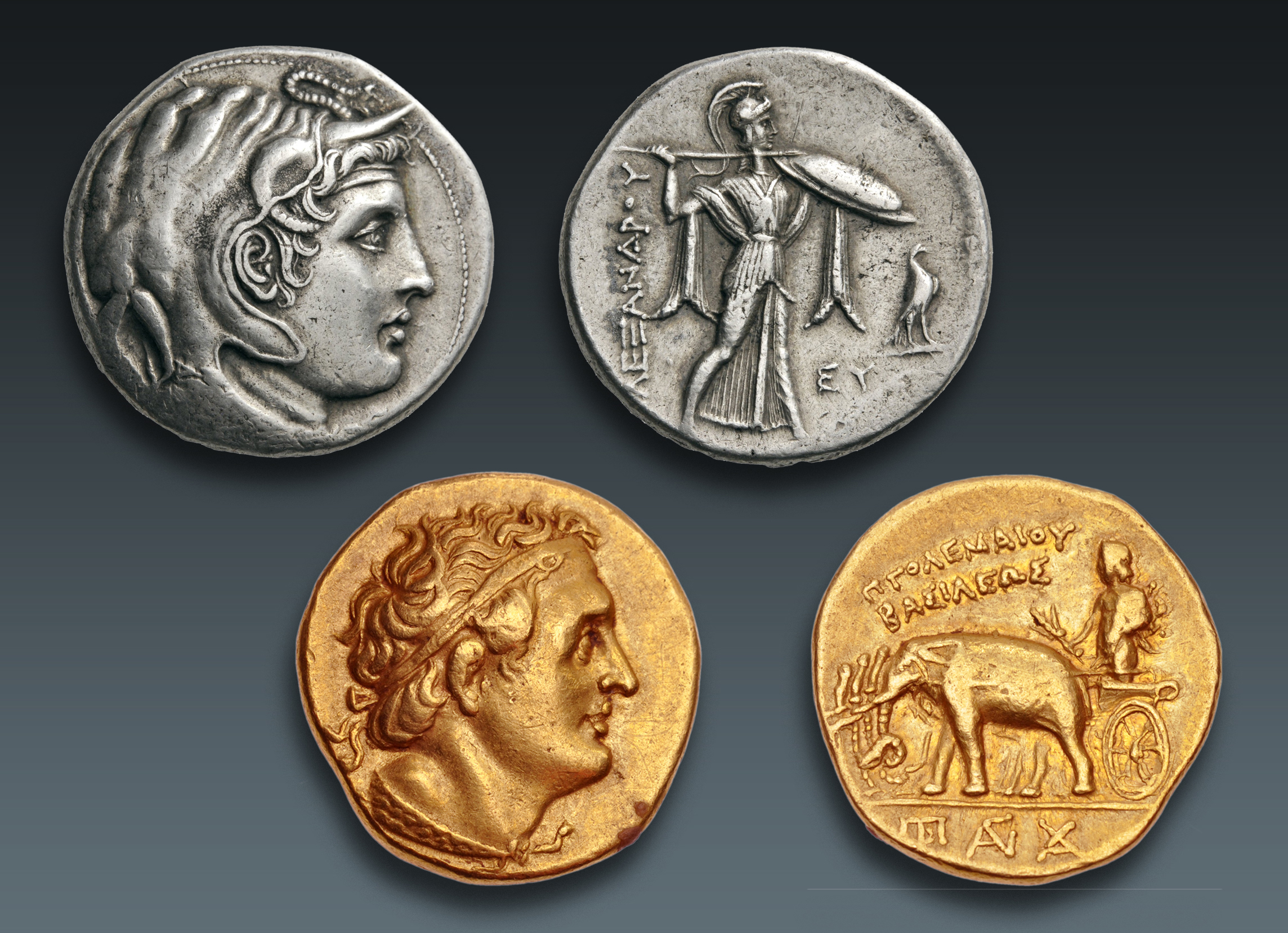 Two coins issued by Ptolemy I: 1) A portrait of the deified Alexander the Great wearing an elephant scalp on his head, with a ram’s horn over his temple, and an aegis (sacred fleece) over his shoulder; on the reverse Athena Alcidemus, the patroness of Pella Silver tetradrachm, Alexandria, c. 312/1-305 BCE; Nomos no. 12, lot 120. 2) A portrait of Ptolemy with diadēma (royal headband) and aegis; on the reverse a deified Alexander holding a thunderbolt and scepter standing in a chariot drawn by four elephants Gold stater, Cyrene or Alexandria, c. 305/4-298 BCE; CNG no. 84, lot 751.