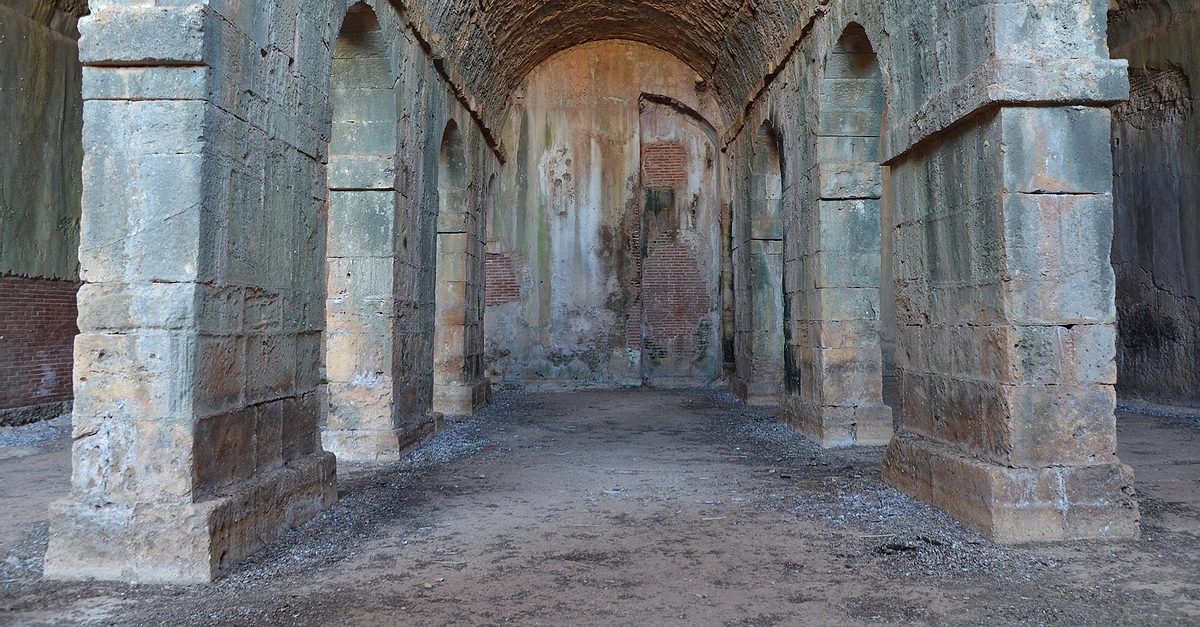 The interior of a three-aisled vaulted Roman cistern at the ancient town of Aptera, Crete. It had three barrel-vaulted aisles divided by two rows of four longitudinal arched piers. In the absence of water sources on the hill of Aptera, the cistern collected rainwater to serve the needs of the city and supply the facilities of the public and private baths. The cistern is of Roman date (1st century - 2nd century CE), at least in its final form.