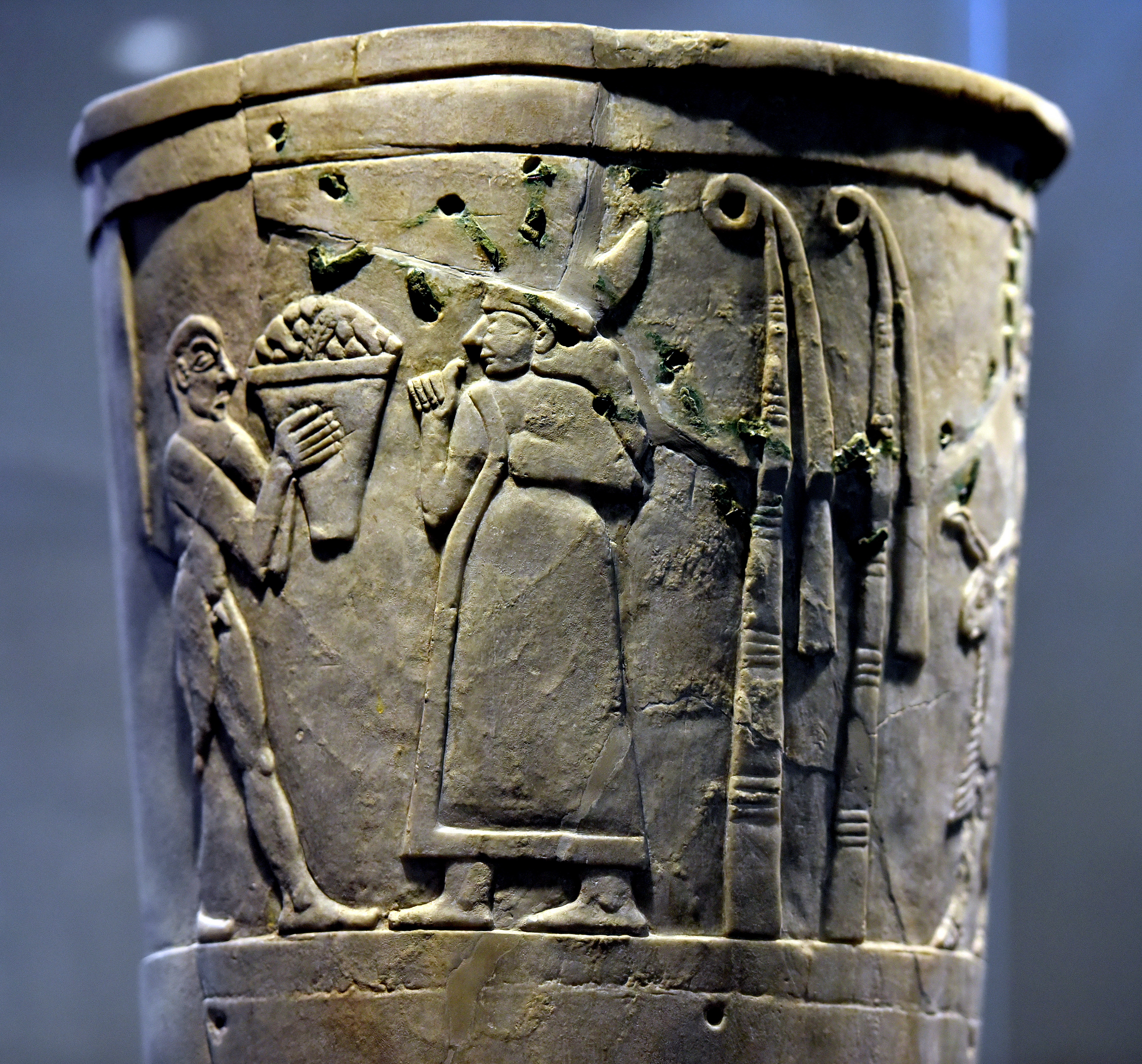 The votive or sacred Warka Vase is decorated with three horizontal registers and shows signs of repair in antiquity. The top register depicts a complete scene. Here, a naked man offers a bowl of fruits and grains to a Mesopotamian female deity, Inanna (Ishtar in Akkadian); there are two bundles of reed behind here, reflecting that this is the temple of Inanna.