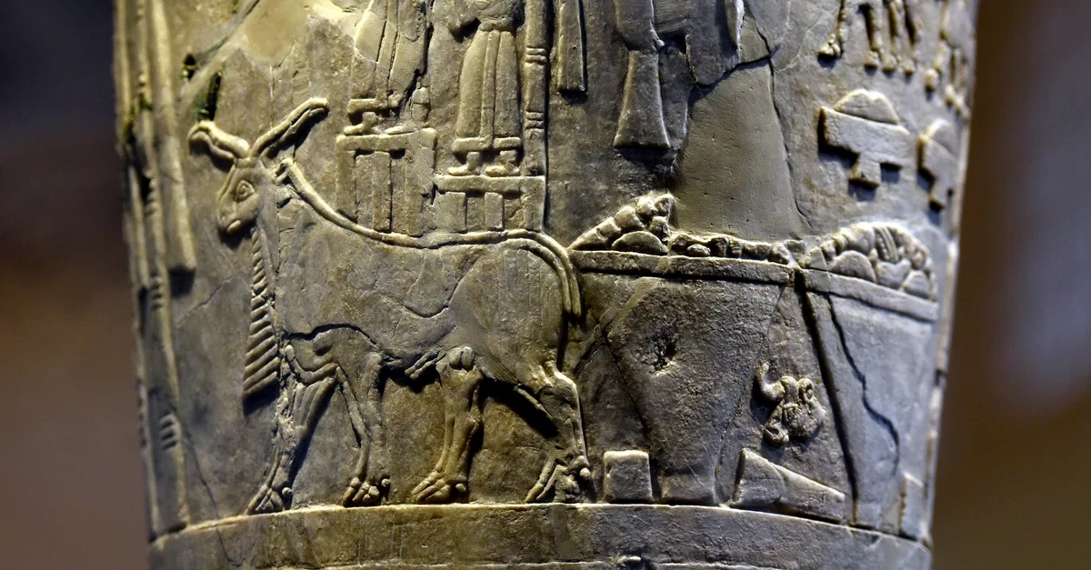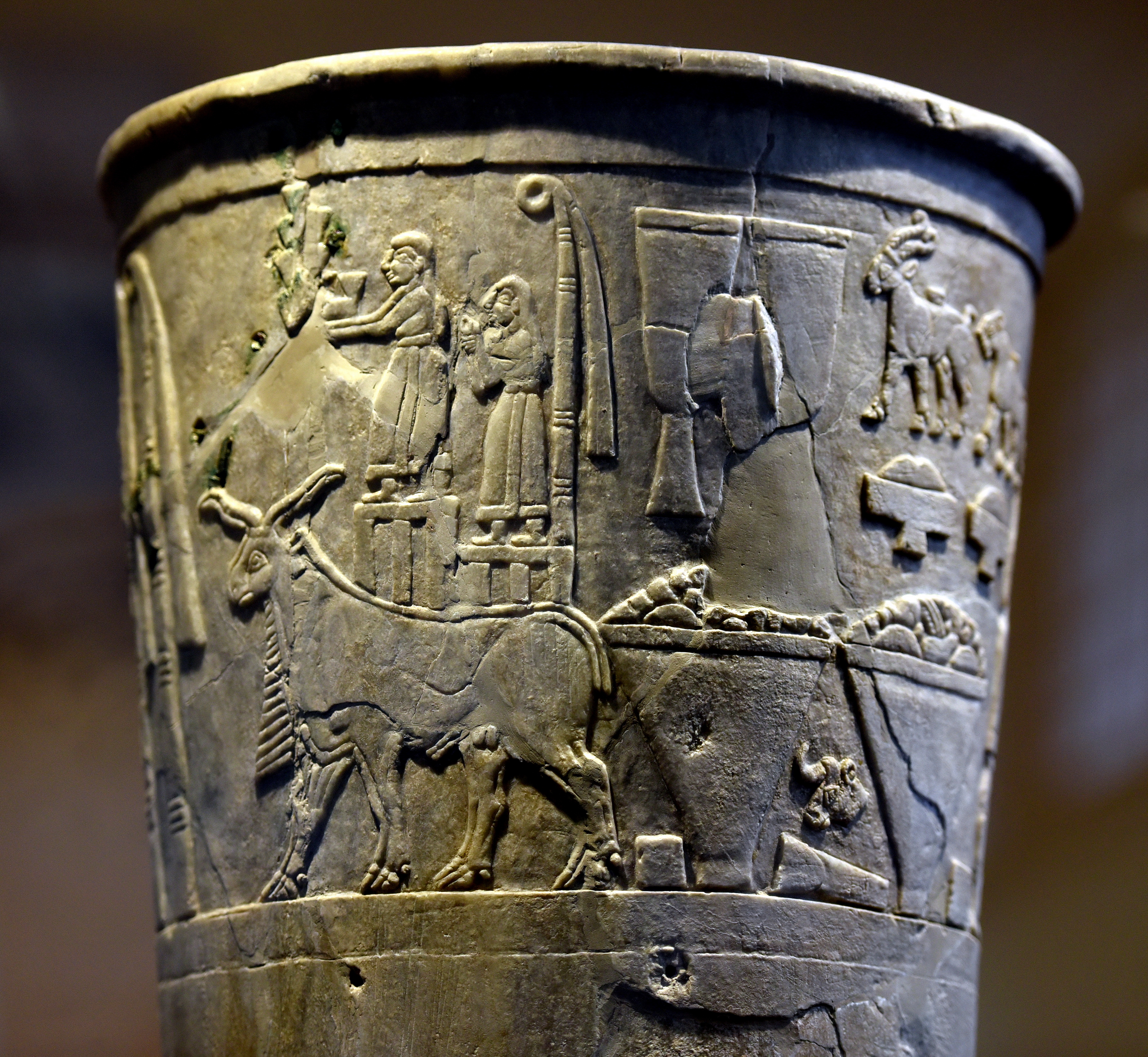 The votive or sacred Warka Vase is decorated with three horizontal registers and shows signs of repair in antiquity. The top register depicts a complete scene. Here, a collection of votive offerings (animals, fruits, and grains) are being given to the Temple of Inanna. The Vase of Warka, is one of the priceless objects in the Iraq Museum and represents one of the earliest examples of surviving narrative art. It was excavated (in fragments) by a German excavation team in a temple complex dedicated to the goddess Inanna at the city of Uruk (in southern Iraq) in 1933-1934 CE. It is about 1 meter tall. From Warka (ancient Uruk), Iraq. Jemdet Nasr Period, 3000-2900 BCE. On display at the Sumerian Gallery in the Iraq Museum in Baghdad, Republic of Iraq.