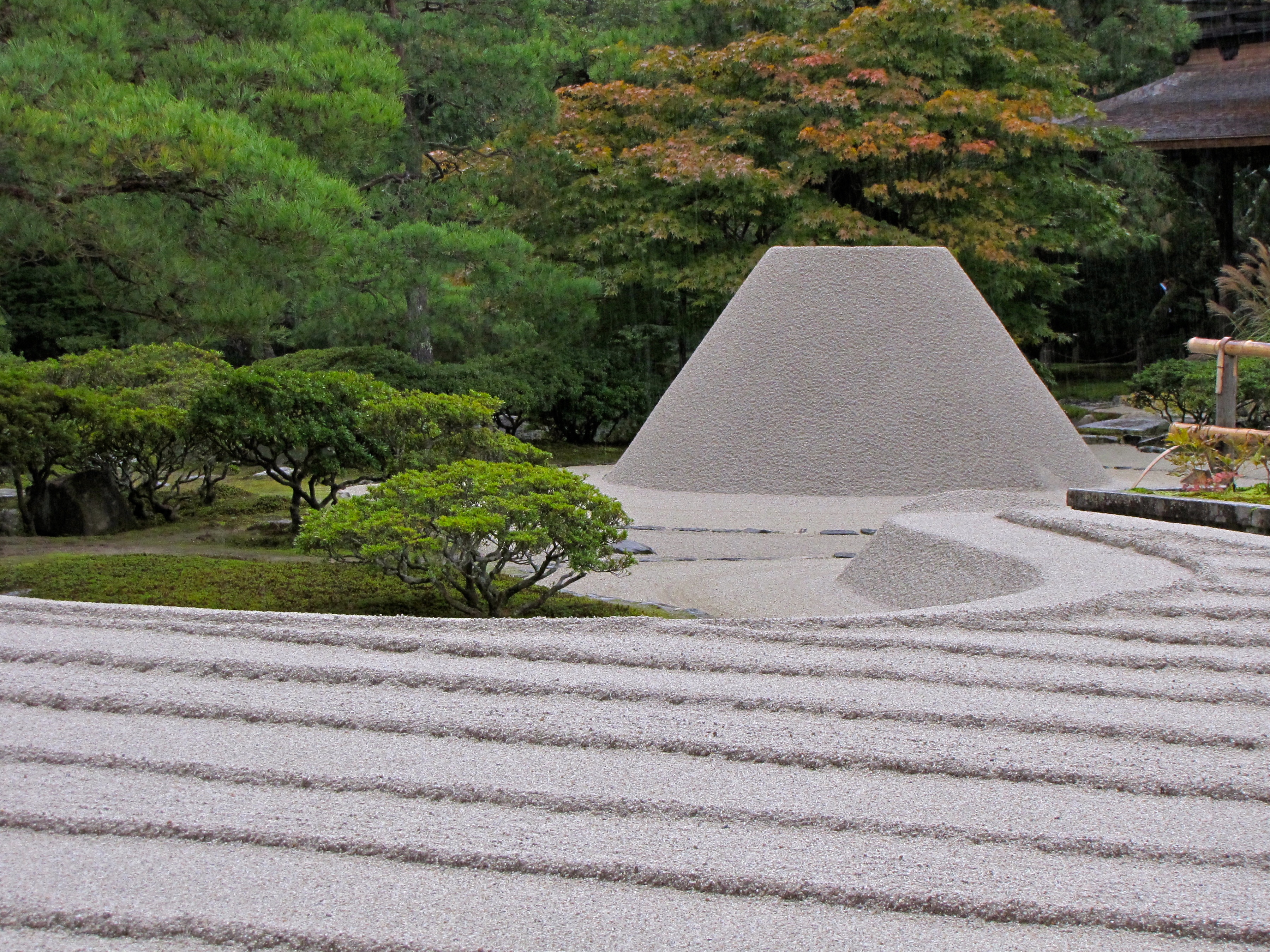 The Sea of Silvery Sand (Ginsha-nada) which replicates the outline of the West Lake in China and the small lunar viewing platform (Kogetsudai) made of sand. The Zen temple complex Ginkaku-ji, Kyoto, Japan. Late 15th century CE.