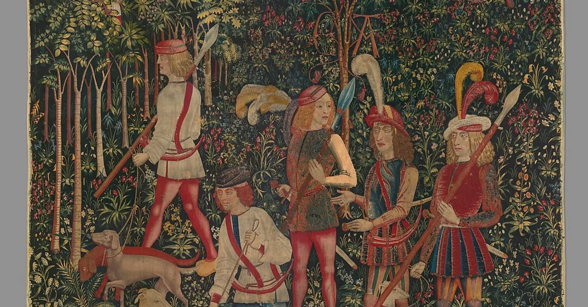 "The Hunters Enter the Woods" is one of seven tapestries in the "Unicorn Tapestries" group. These allegorical tapestries depict the hunting of a unicorn, a mythological animal common to European folklore. "The Hunters Enter the Woods" depicts a group of hunters entering the woods with their hounds, eager to begin the hunt. The tapestries originally belonged the Le Rochefoucald family of France, and the earliest record of them confirms that they were hanging in the Paris home of François VI de La Rochefoucauld (1613 - 1680 CE) by 1680 CE. The tapestries are thought to have been woven in Brussels, although they were designed in Paris, France. The Unicorn Tapestries are now held by the Metropolitan Museum of Art in New York, and are housed in the Met Cloisters.