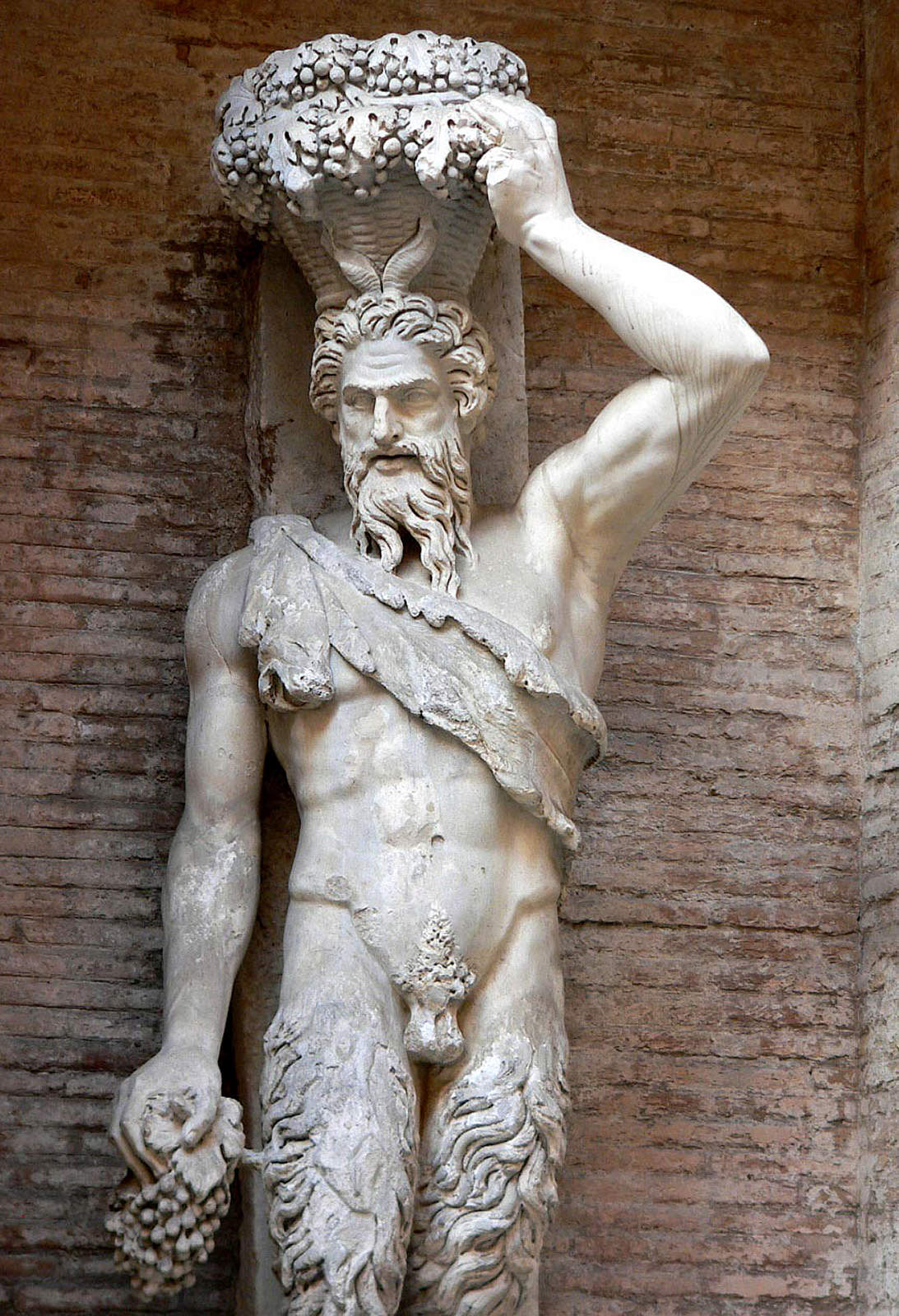 A typical depiction of the pastoral god Pan with goat legs and horns. 1st century BCE, from near the theatre of Pompey, Rome. (Capitoline Museum, Rome).