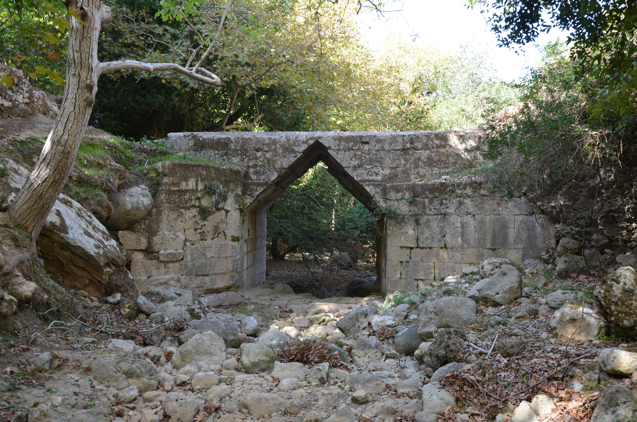 The Eleutherna Bridge on Crete is a well-preserved Hellenistic corbel arch bridge with a single span of 3.95 m. It was built with large limestone blocks in dry masonry around 330 - 367 BCE when a major construction project took place at Eleutherna.