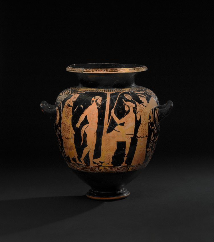 An Attic red-figure stamnos depicting the satyr Silenus being led before the seated King Midas. c. 440 BCE attributed to the Midas painter. (British Museum, London).