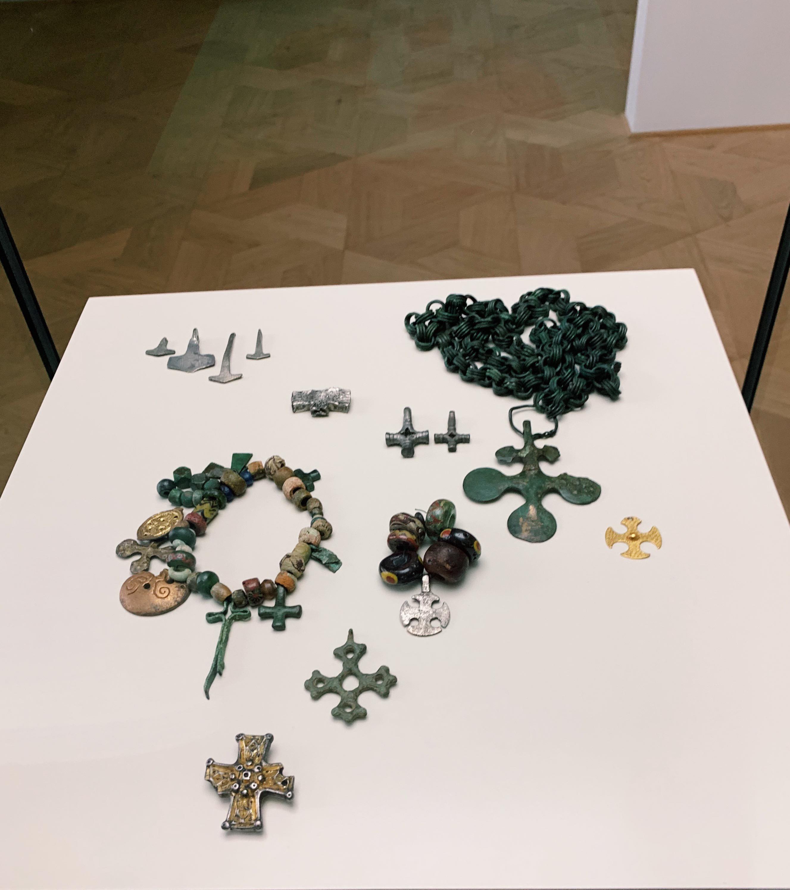 Viking jewelry dating from the 800 - 1100 century CE, showing the transition from Norse Mythology to Christianity. The older pieces depict Thor's hammer, while the latter depicts the Christian cross. Exhibited at the Museum of Cultural History in Oslo, Norway.