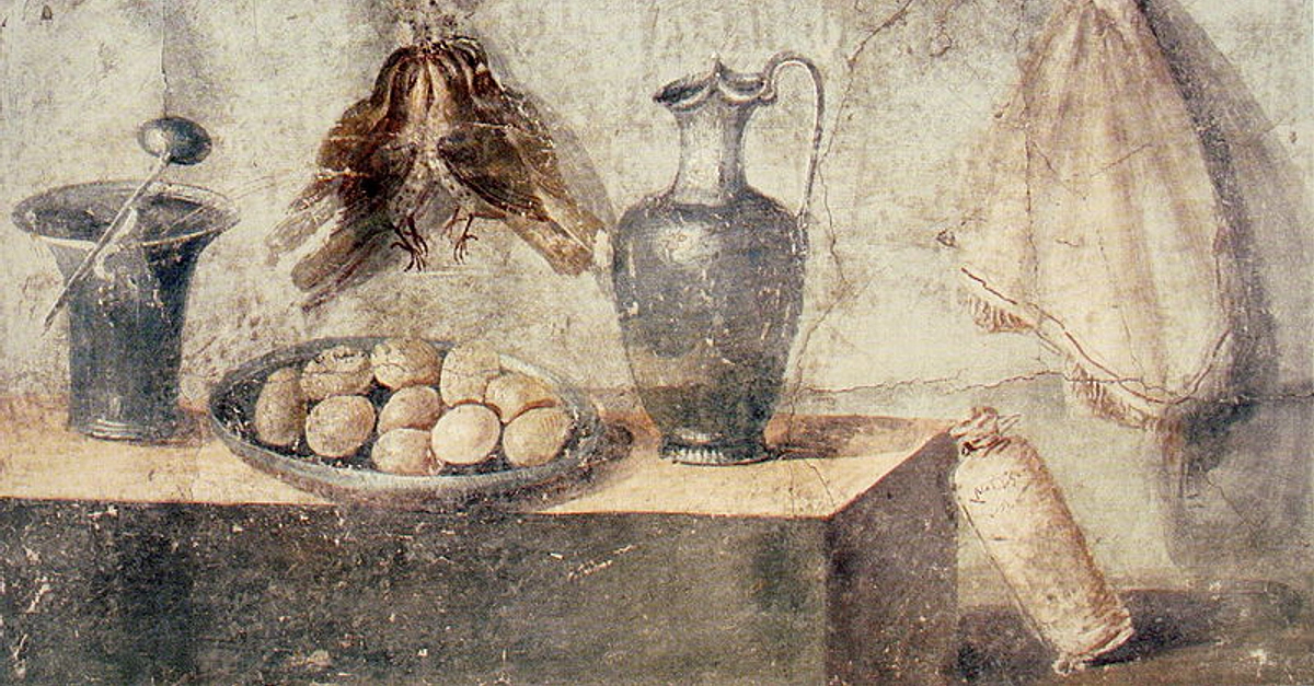 A fresco depicting eggs, birds, and bronze dishes. From Pompeii c. 50-79 BCE. This fresco is part of the collection of the National Archaeological Museum of Naples.