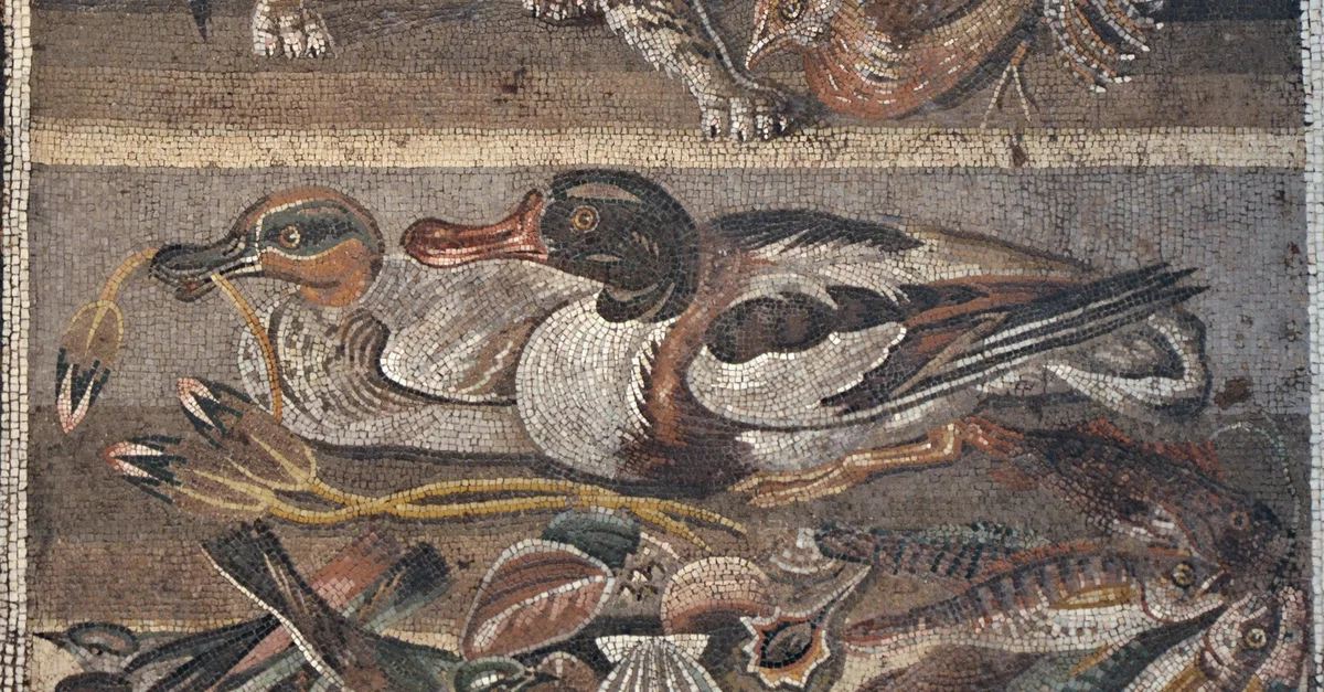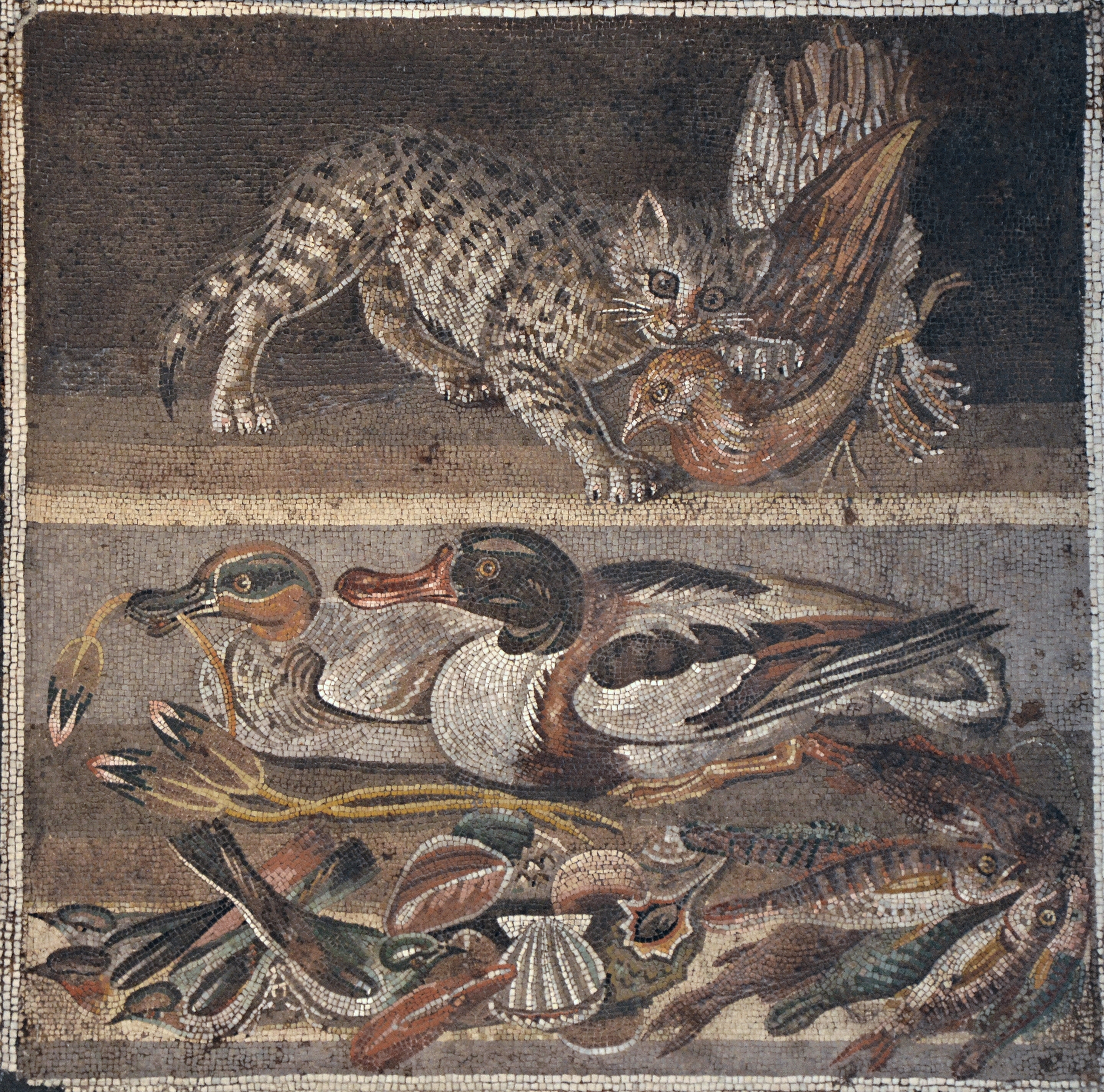 Roman mosaic from the House of the Faun in Pompeii, Italy. In the upper register, a cat clutches a quail. In the lower register, two ducks feed next to an assortment of seafood.