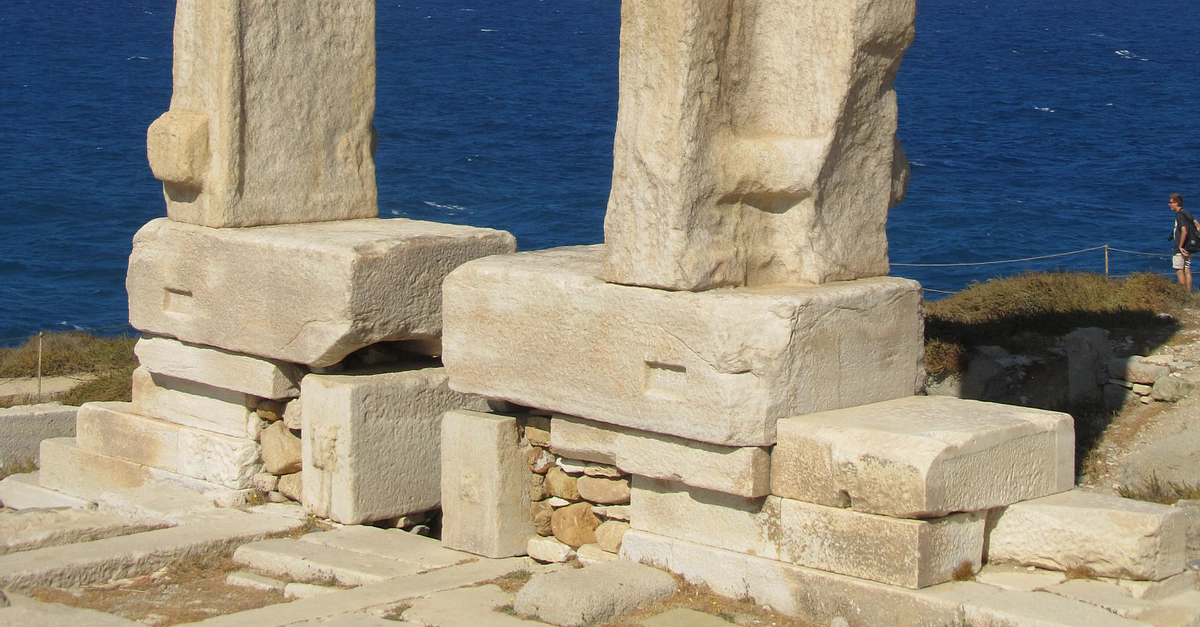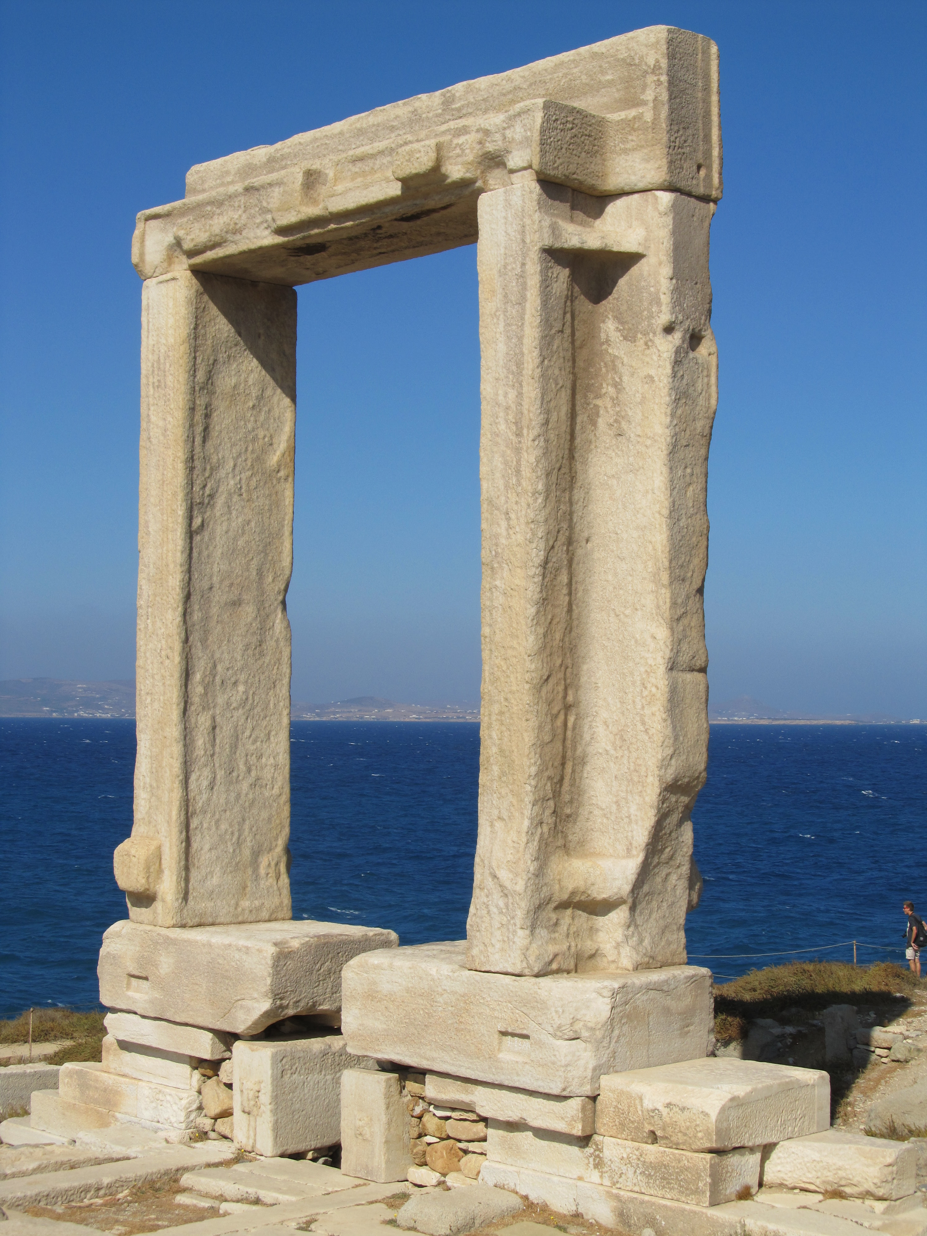 The Portara of Naxos. The doorway leading from the prodromos to the cella of the 6th century BCE temple of Apollo. The doorway is 6m high and 3.5 m wide. The temple itself, as indicated by its surviving foundations, measured some 59 by 28 metres.