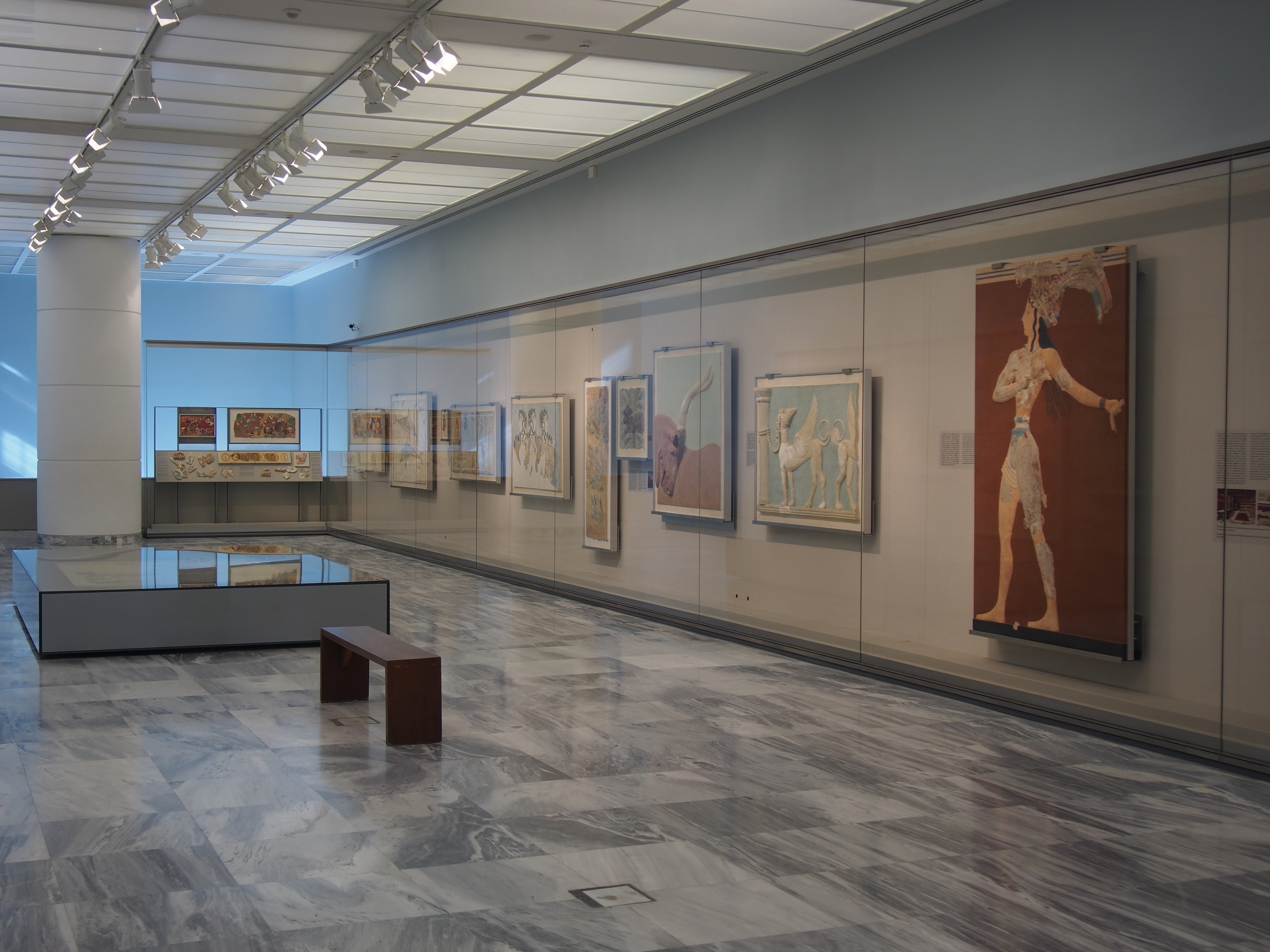 The rooms of Minoan frescoes, Archaeological Museum of Heraklion. At the right end is the fresco of the Prince with the Lilies.