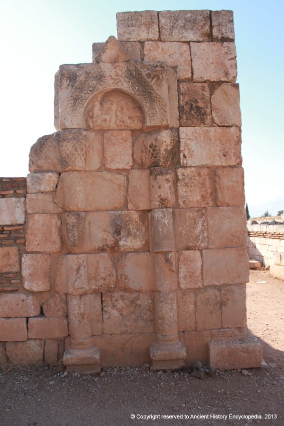 Mihrab or niche in the wall of a mosque at Anjar (8th century CE) that indicates the qibla or direction to Mecca, decorated by an apex arch lintel carved with vegetal carving above Byzantine characters.
