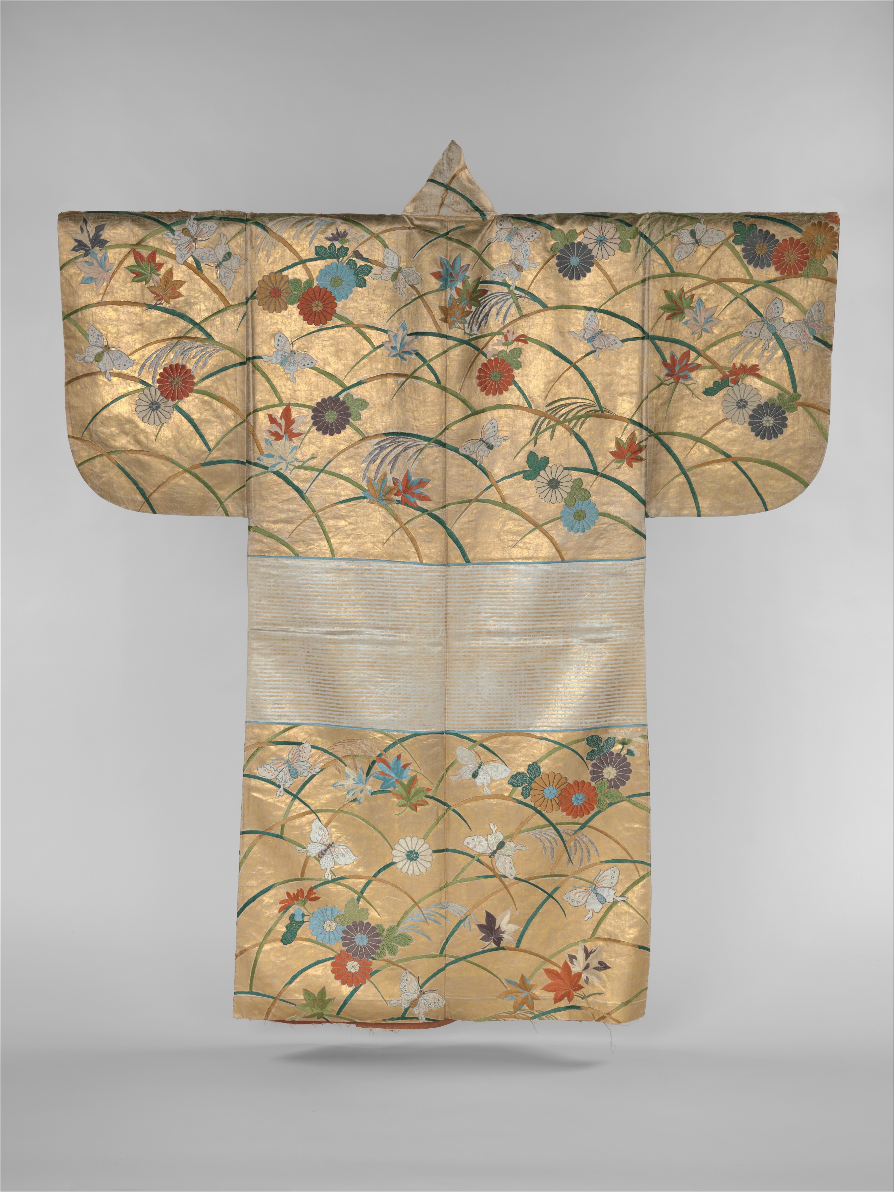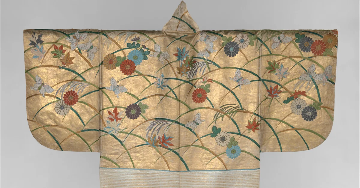 An embroidered and gold leaf silk robe used in Noh theatre. The designs include butterflies, chrysanthemums, maple leaves, and miscanthus grass. 18th century CE. (Metropolitan Museum of Art, New York)
