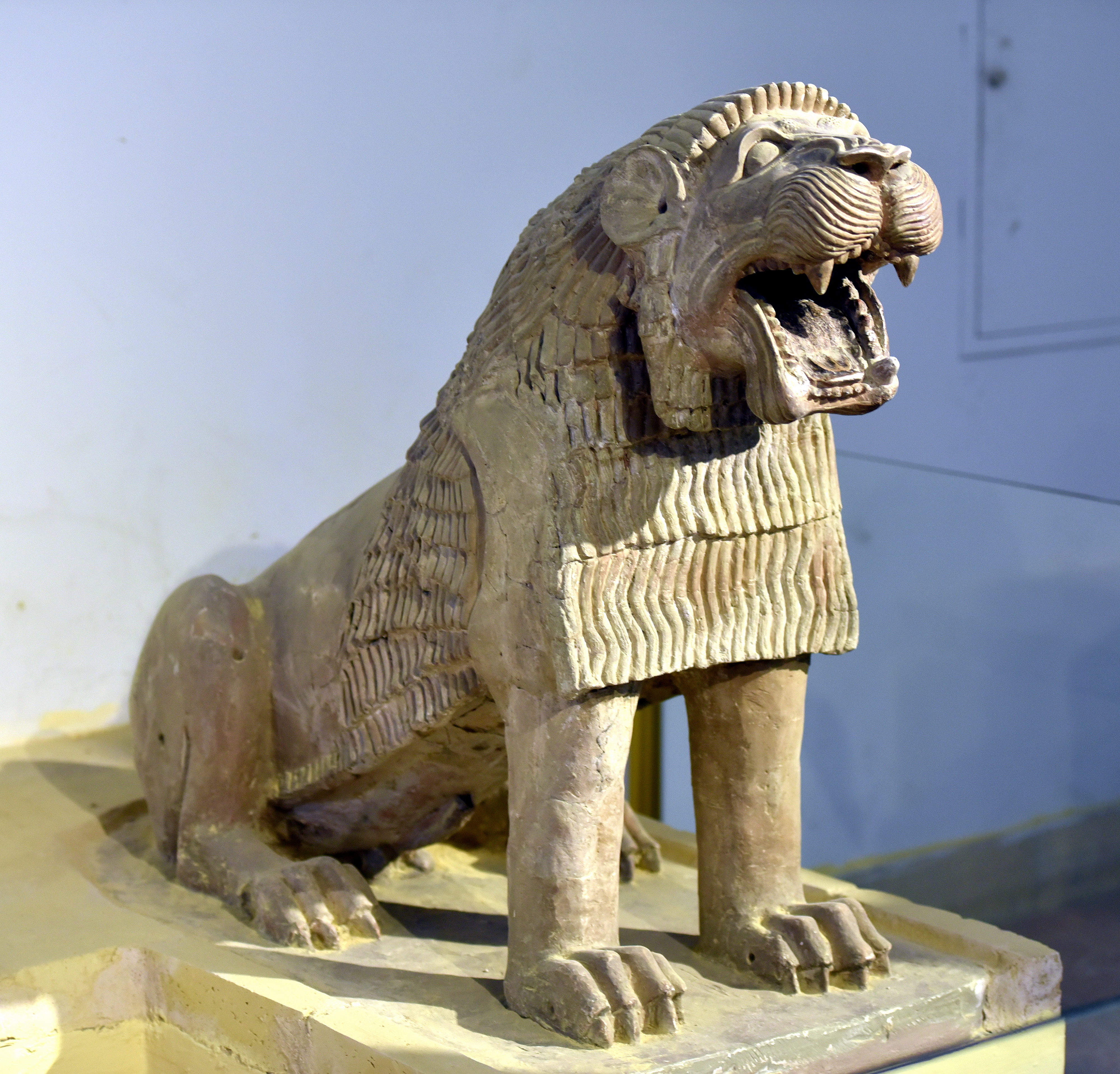 This terracotta lion was found at the entrance to the Dagan Temple at Tell Harmal (ancient Shaduppum), in the eastern outskirt of Baghdad. The temple was dedicated to Nisaba (goddess of the grain and writing) and her consort, Haja. The temple was a typical Old-Babylonian one, with a short staircase made of mudbricks and flanked by platforms, on which those lions once stood. The lion was constructed from many fragments. The gaping jaw and bristly mane would avert any evil from entering the temple. Baked and molded clay (with a hollow interior). Old Babylonian period, c. 1800 BCE. On display at the Iraq Museum in Baghdad, the Republic of Iraq.