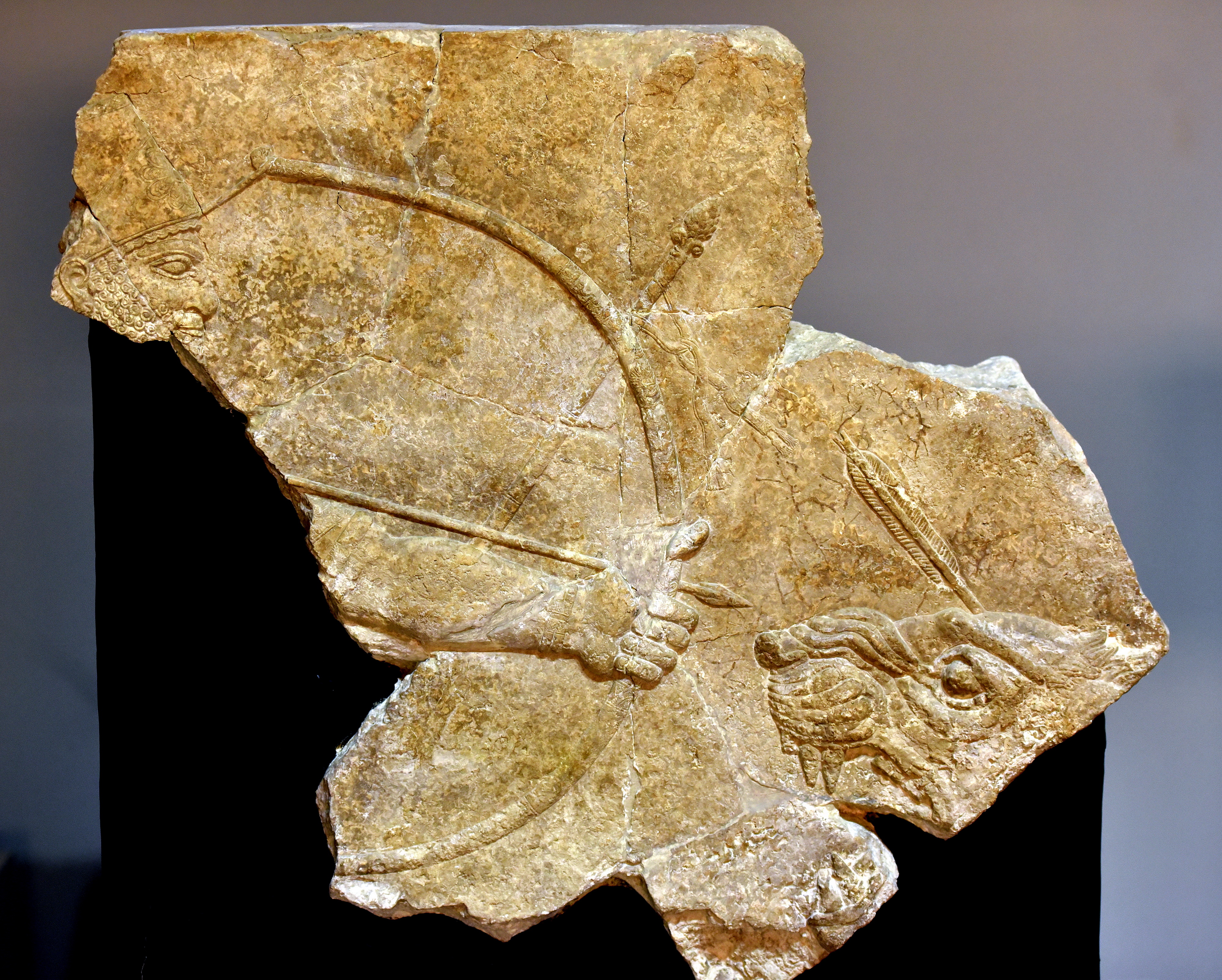 This survived alabaster bas-relief was found in Khorsabad (ancient Dar-Sharrukin, Mesopotamia, Iraq). An Assyrian king, probably Sargon II (r. 722-705 BCE), shoots an arrow and a lion (hit by another arrow) appears. Late 8th century BCE. On display at the Iraq Museum in Baghdad, Republic of Iraq.