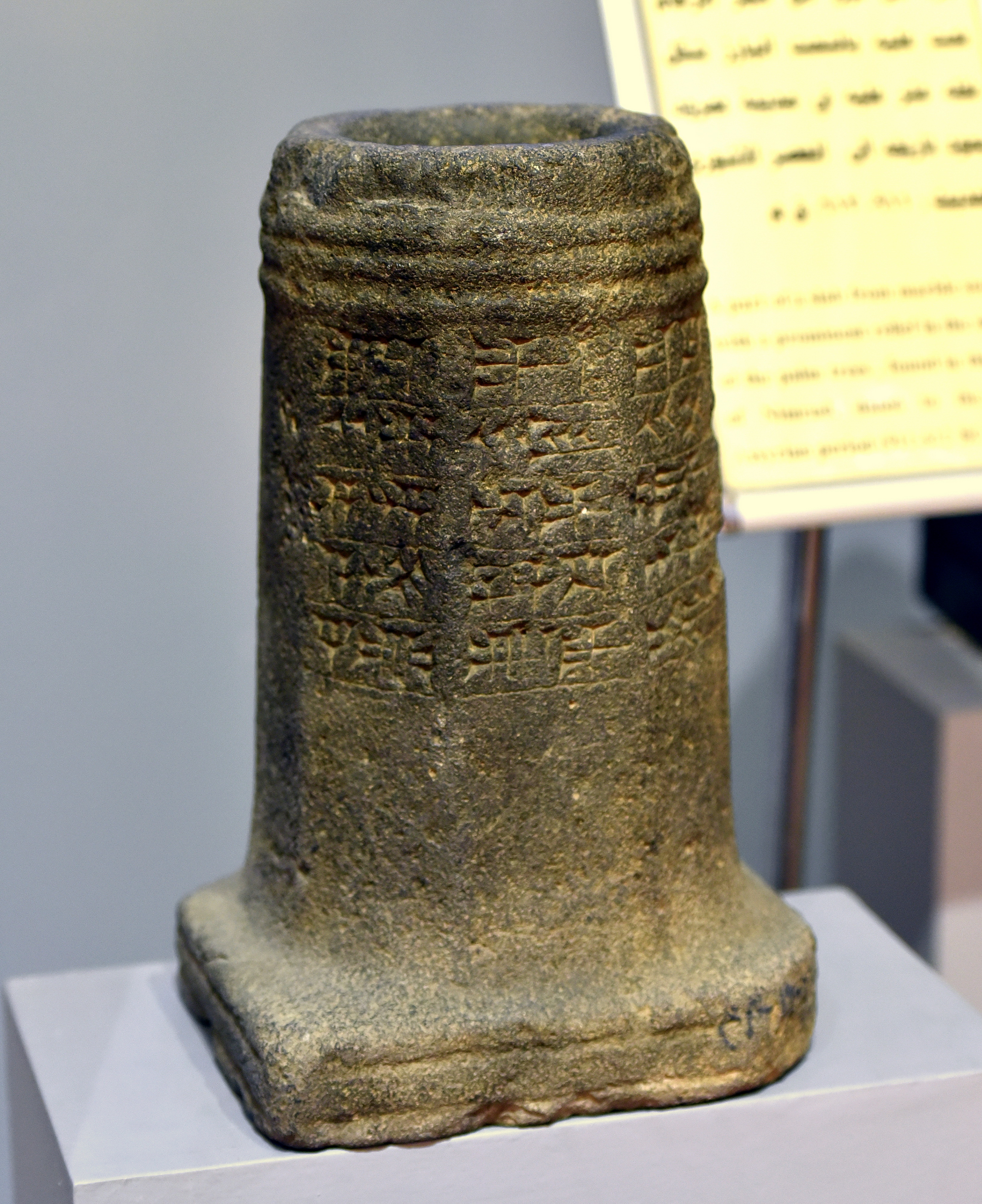 This basalt container was inscribed with the name of the Assyrian king Tukulti-Ninurta II (r. 891-884 BCE). It was probably used for placing flags before certain deities. From Nimrud, Iraq. On Display at the Iraq Museum in Baghdad, Republic of Iraq.