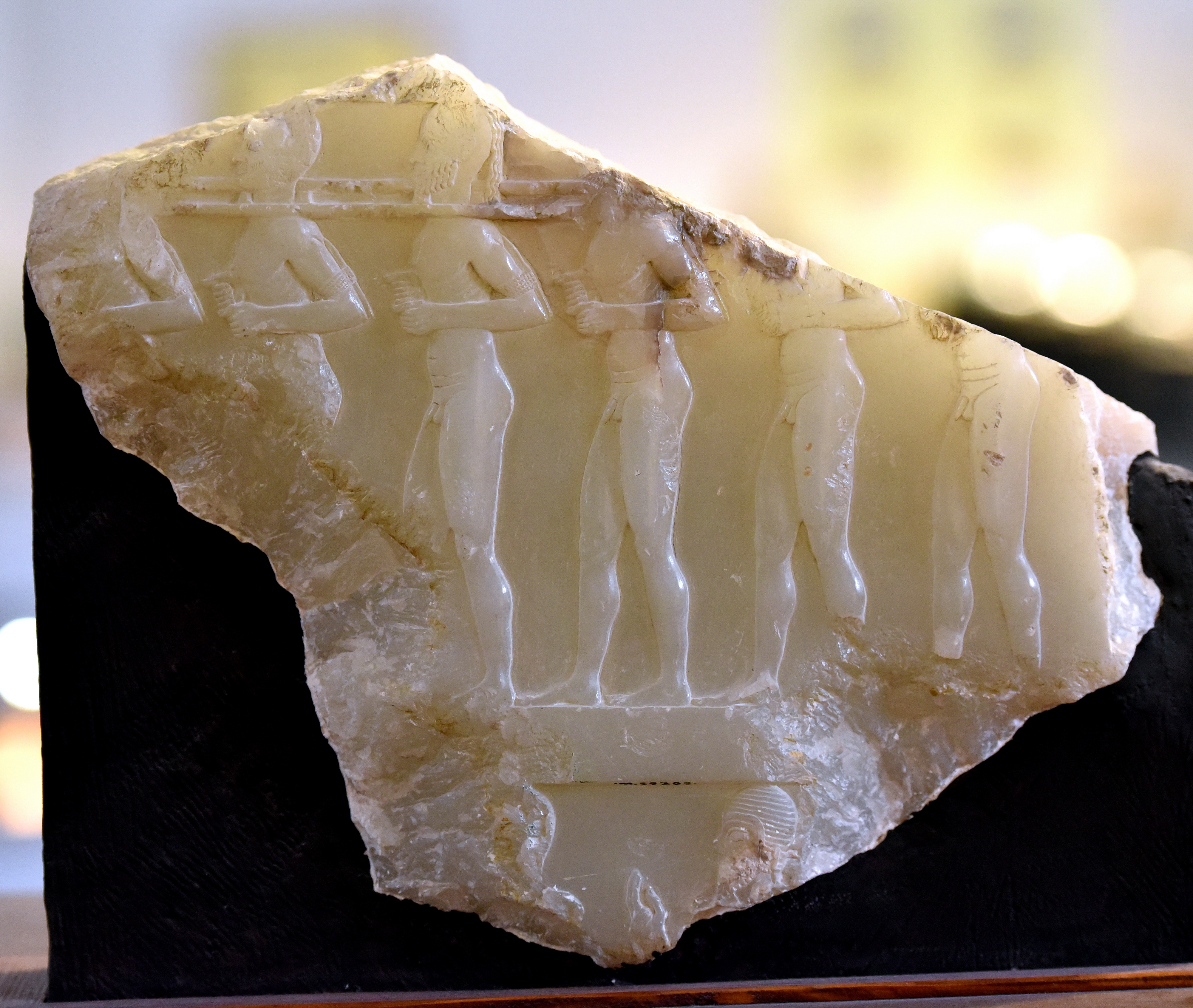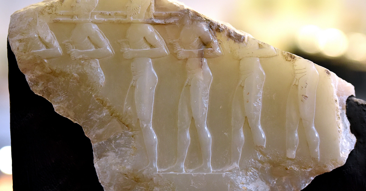 This alabaster stele (with different registers) was fragmented when originally found and only three fragments have survived; two are in the Iraq Museum in Baghdad and one is in the Museum of Fine Arts, Boston, USA. The stele commemorates one of Naram-Sin’s military victories in modern-day Anatolia, Turkey. This fragment depicts a procession of fettered nude prisoners of wars led by Akkadian soldiers (missing from this scene). At the lower part, the ribbed or quilted helmet and head of an Akkadian soldier appears. From al-Hay district, in modern-day Wasit Governorate, Iraq. Akkadian period, reign of Naram-Sin of Akkad, 2254 - 2218 BCE. On display at the Iraq Museum in Baghdad, Republic of Iraq. The Oriental Institute of the University of Chicago's "Lost Treasures of Iraq" website says it was excavated at Nasiriyah (in modern-day Dhi Qar Governorate) and gives it "unknown status" after the ransacking of the Iraq Museum in April 2003.