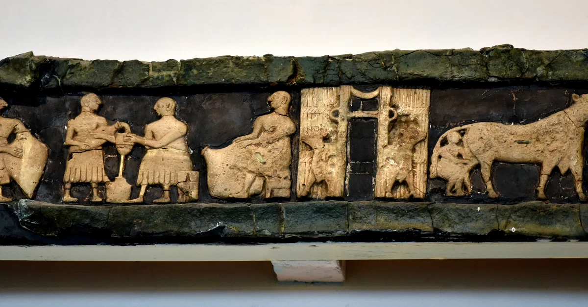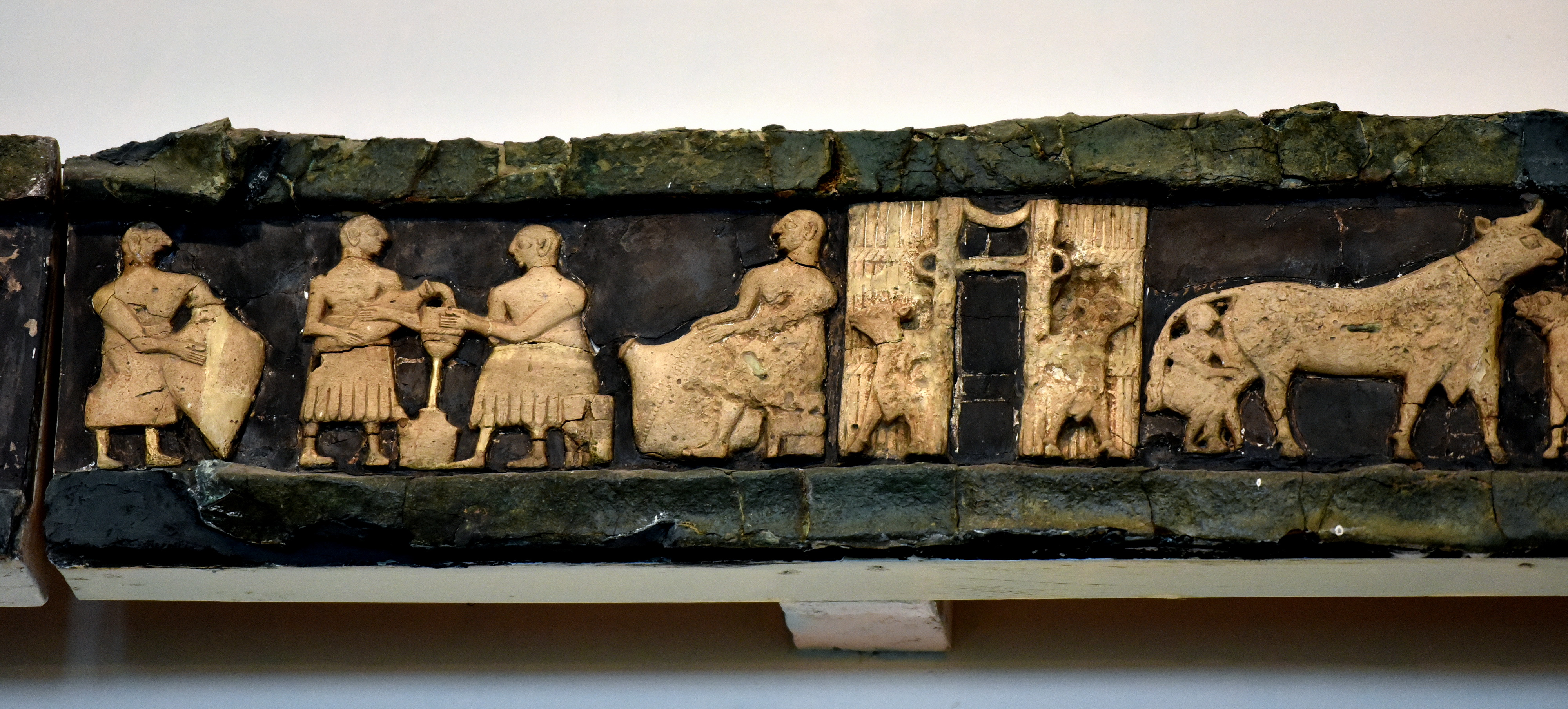 This scene is part of a long one depicting Sumerians milking cows and preparing dairy products. The scene once decorated a frieze on the facade of the Temple of Ninhursag at Tell al-'Ubaid, in modern-day Dhi Qar Governorate, Iraq. Early Dynastic period, 2800-2600 BCE. On display at the Iraq Museum in Baghdad, Republic of Iraq.