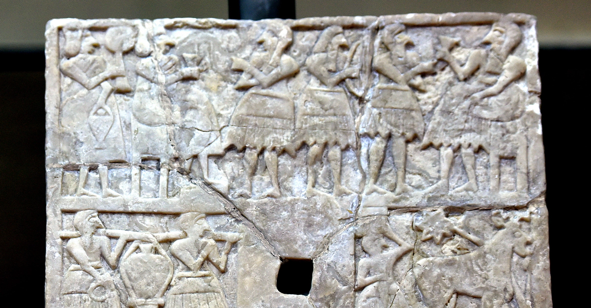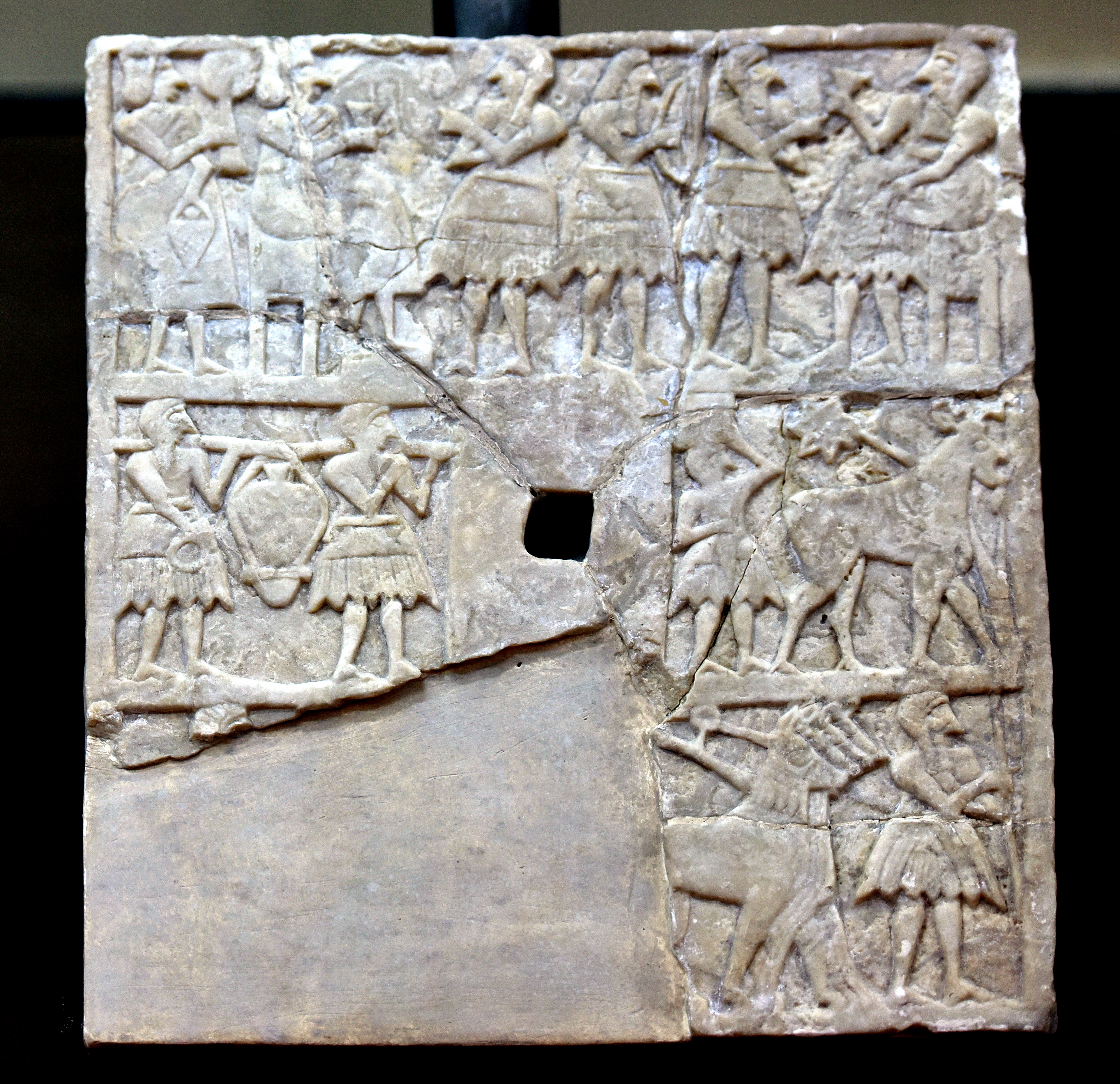 This limestone plaque was excavated by the Oriental Institute of the University of Chicago in the early 1930s, 1st season. It depicts three scenes in three registers. The upper register shows a banquet scene with musicians. The middle register shows men bringing jars. The lower register shows four horses (the chariot is now lost). There is a square hole at the middle for wall fixation. Early Dynastic period, c. 2600 BCE. From Khafajah (ancient Tutub), Iraq. On display at the Iraq Museum in Baghdad, Republic of Iraq.